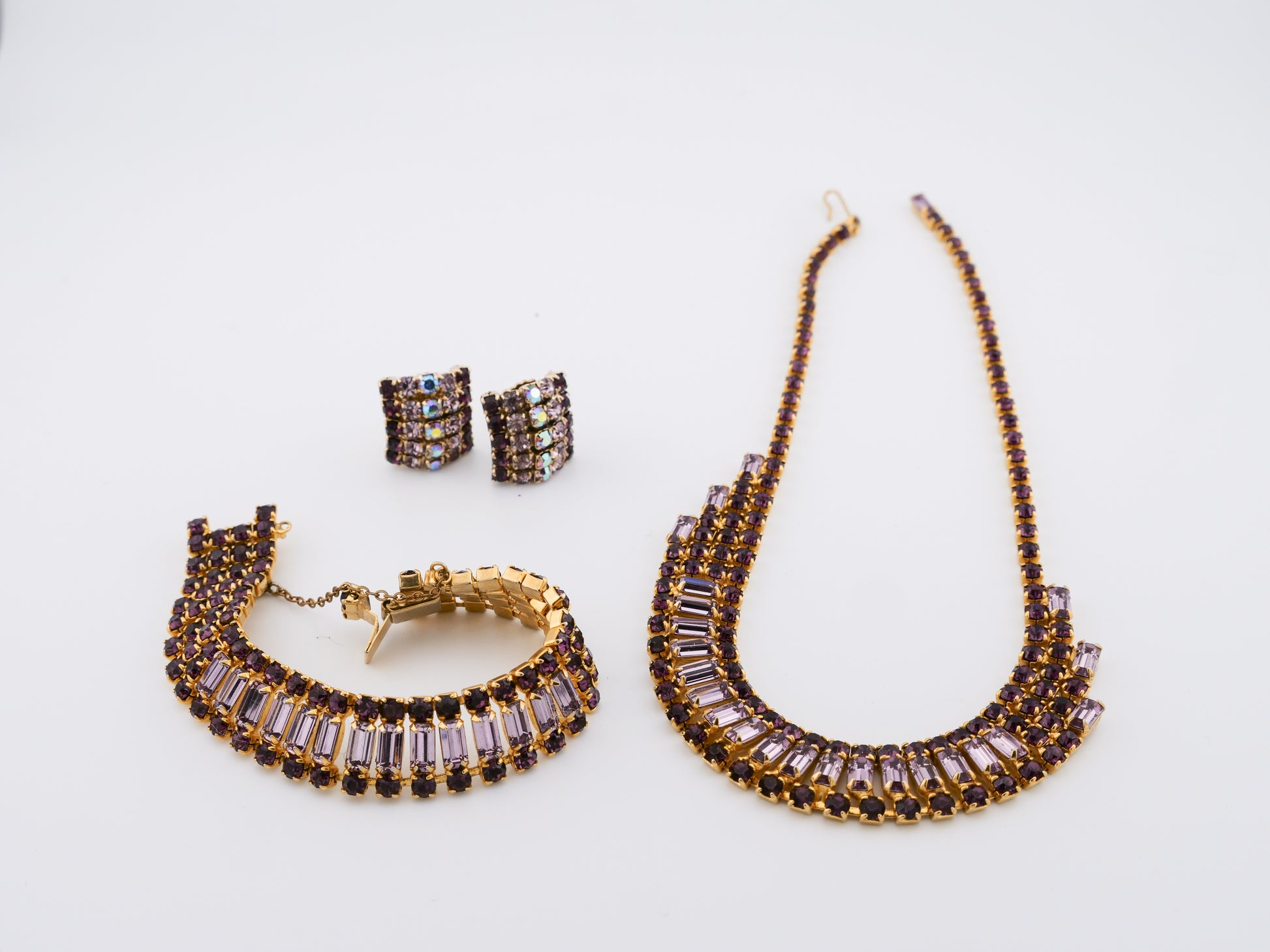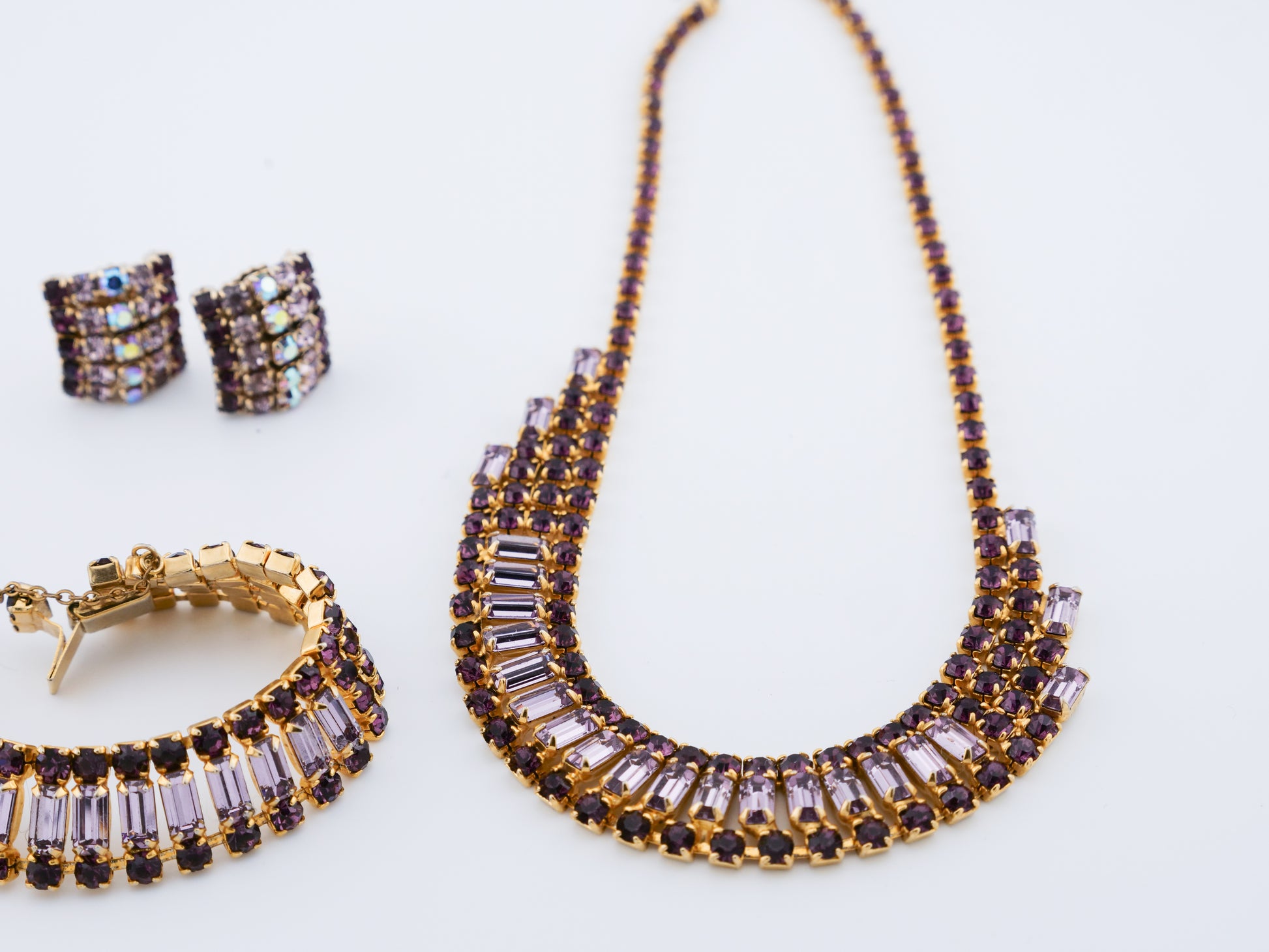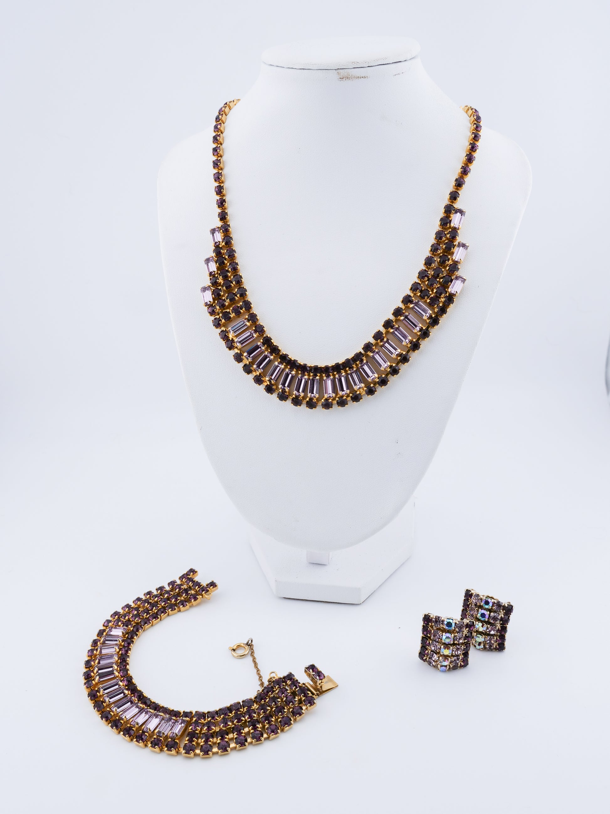 This vintage Weiss set includes a dramatic multi-row rhinestone necklace, a matching bracelet, and coordinating earrings — all crafted with the precision and crystal quality the house of Weiss is known for. Deep amethyst-toned round stones are paired with clear baguette-cut crystals, creating contrast, depth, and a rhythmic play of light. Set in warm gold-tone metal, each piece feels intentional and substantial, with the necklace designed to sit perfectly at the collarbone in a softly graduated curve.