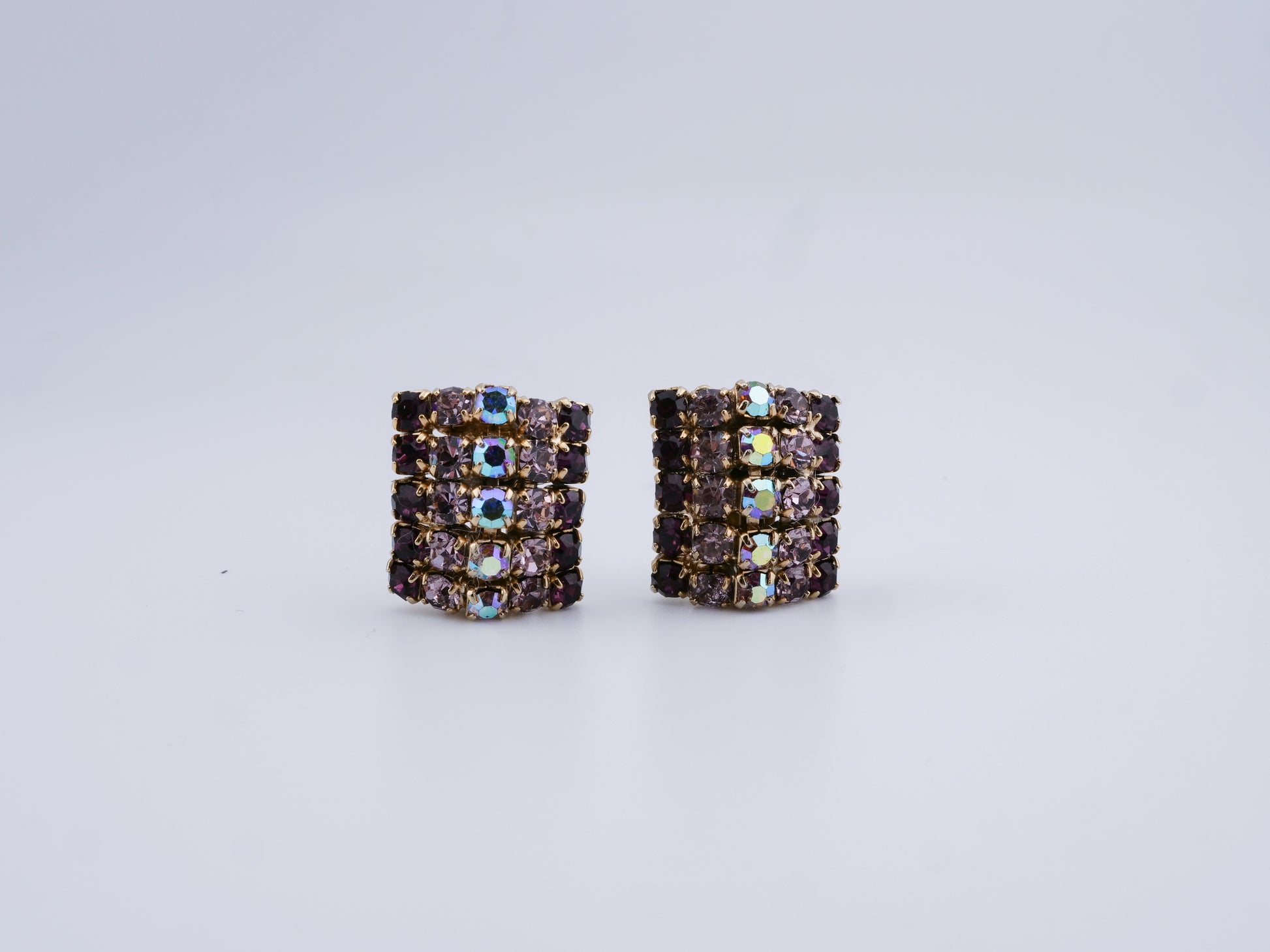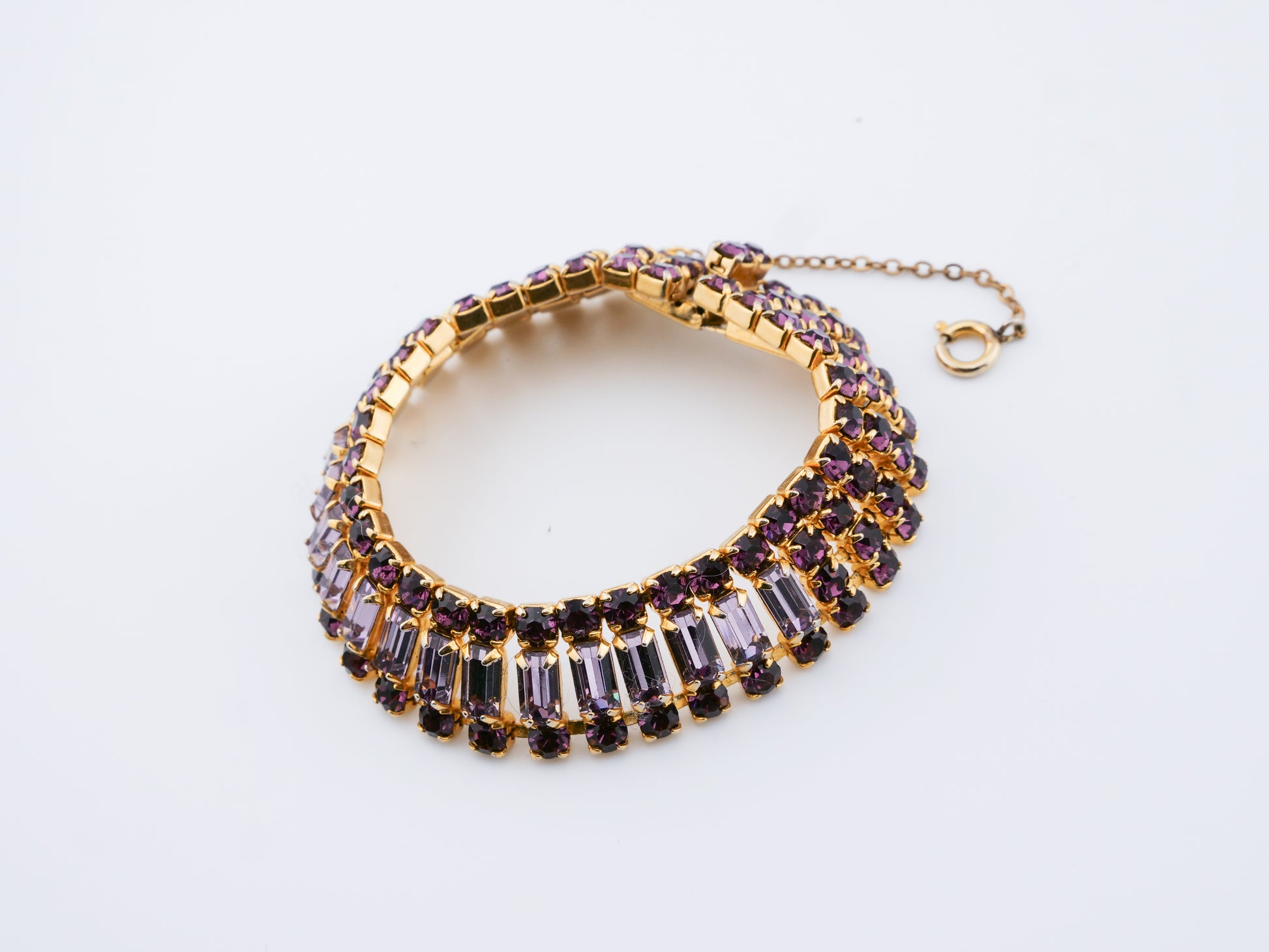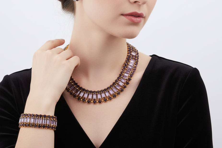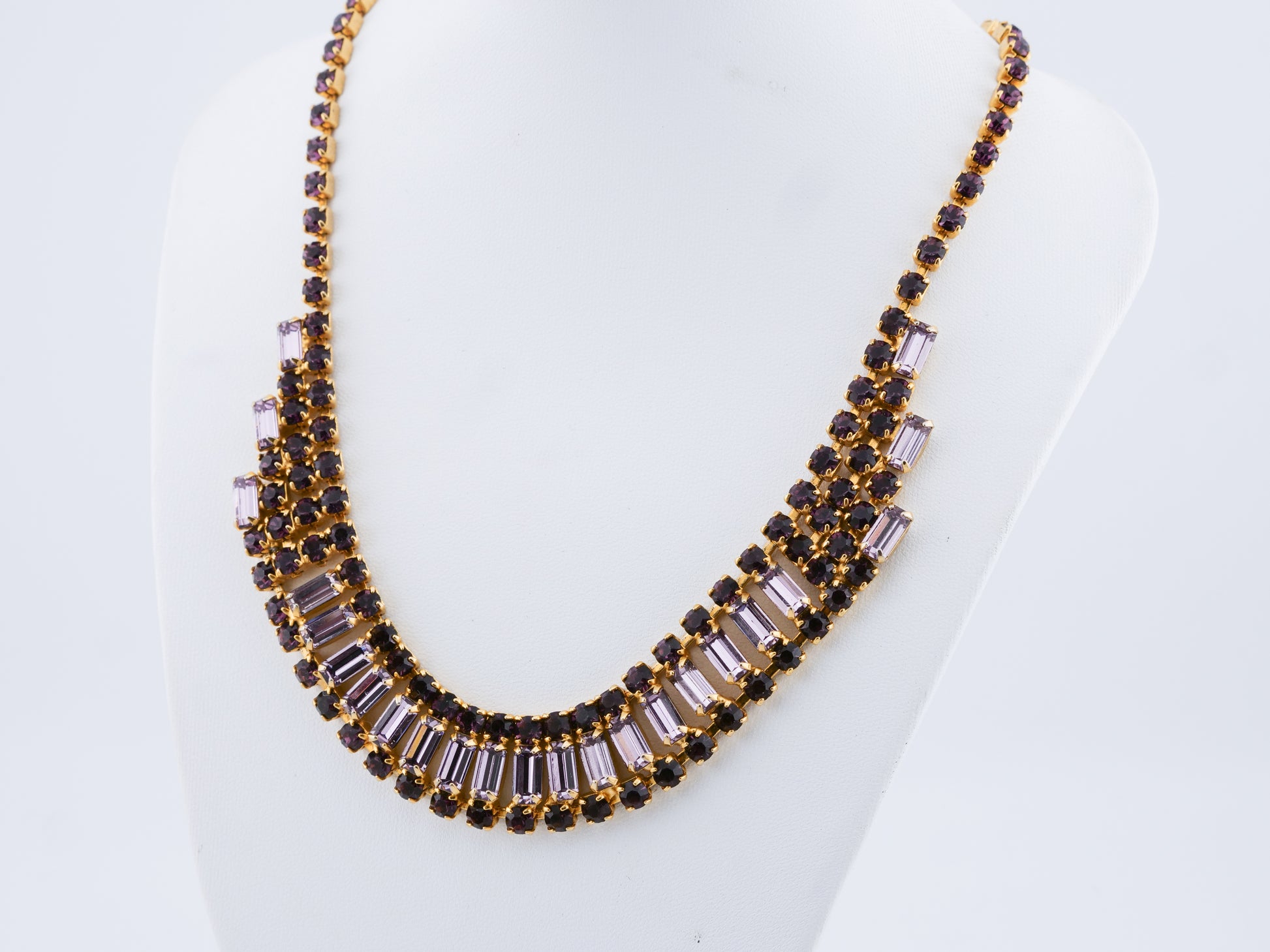This vintage Weiss set includes a dramatic multi-row rhinestone necklace, a matching bracelet, and coordinating earrings — all crafted with the precision and crystal quality the house of Weiss is known for. Deep amethyst-toned round stones are paired with clear baguette-cut crystals, creating contrast, depth, and a rhythmic play of light. Set in warm gold-tone metal, each piece feels intentional and substantial, with the necklace designed to sit perfectly at the collarbone in a softly graduated curve.