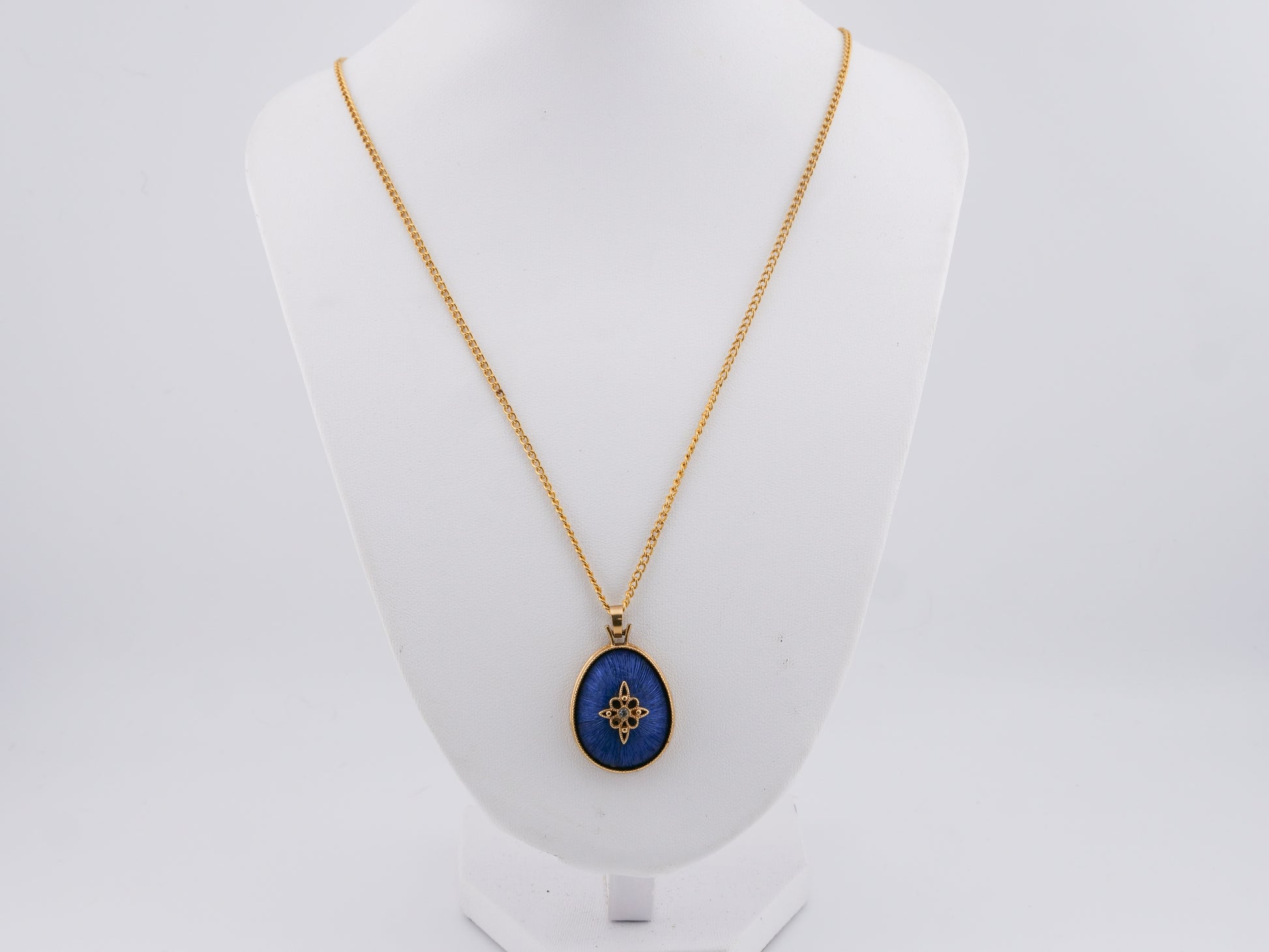 This vintage Avon pendant features a deep cobalt-blue enamel ground with a radiant North Star motif at its center, framed in warm gold-tone metal. The enamel has that beautiful, light-catching striation Avon was especially good at — rich in color without feeling flat — while the star design adds a subtle celestial symbolism that feels both romantic and grounding.