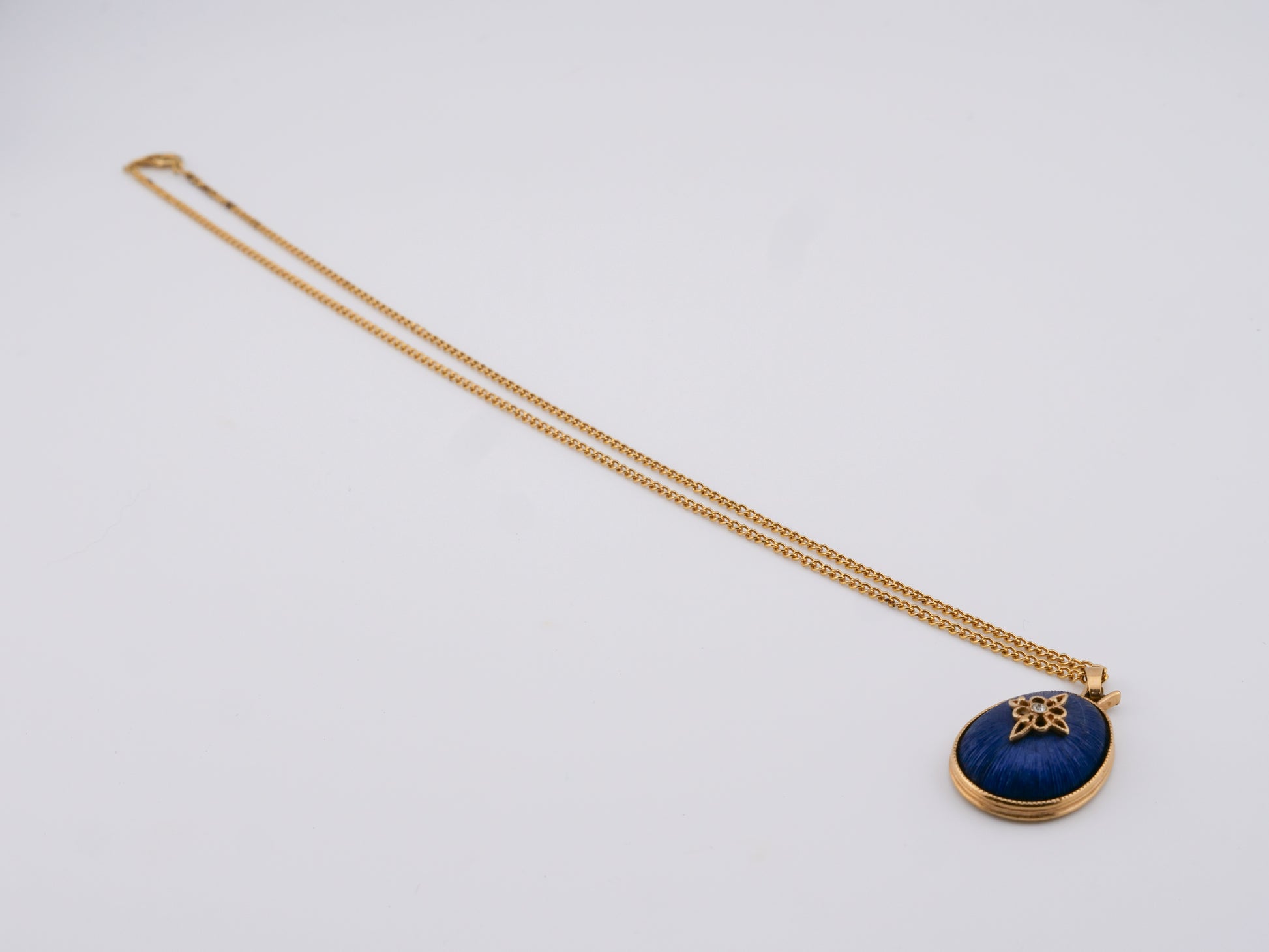 Suspended from a classic gold-tone chain, this piece wears easily on its own or layered with other talismans. It’s unmistakably vintage but timeless in spirit — the kind of necklace that feels personal, like something chosen for meaning rather than trend. A quiet statement with just enough glow.