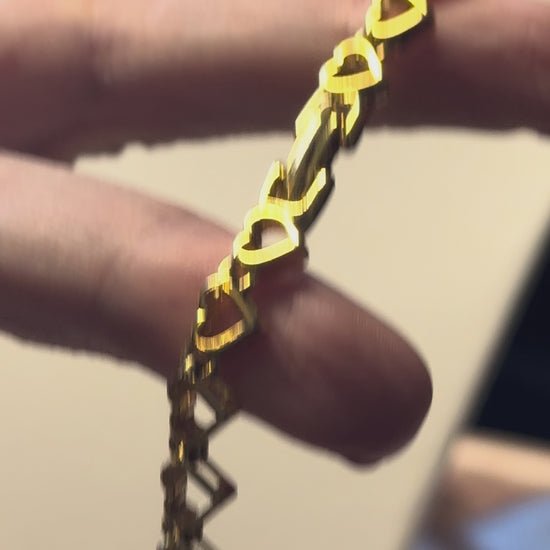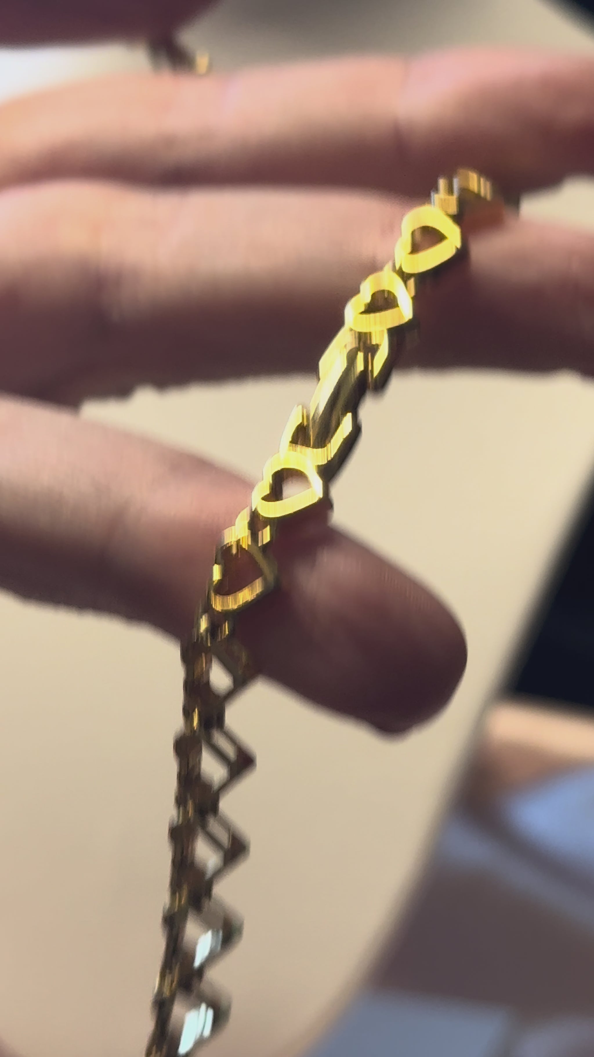 This vintage gold-tone necklace features a continuous row of openwork hearts, linked one after another in a rhythmic chain of love. Lightweight yet striking, it drapes gracefully along the collarbone, creating a delicate shimmer that’s both romantic and versatile.