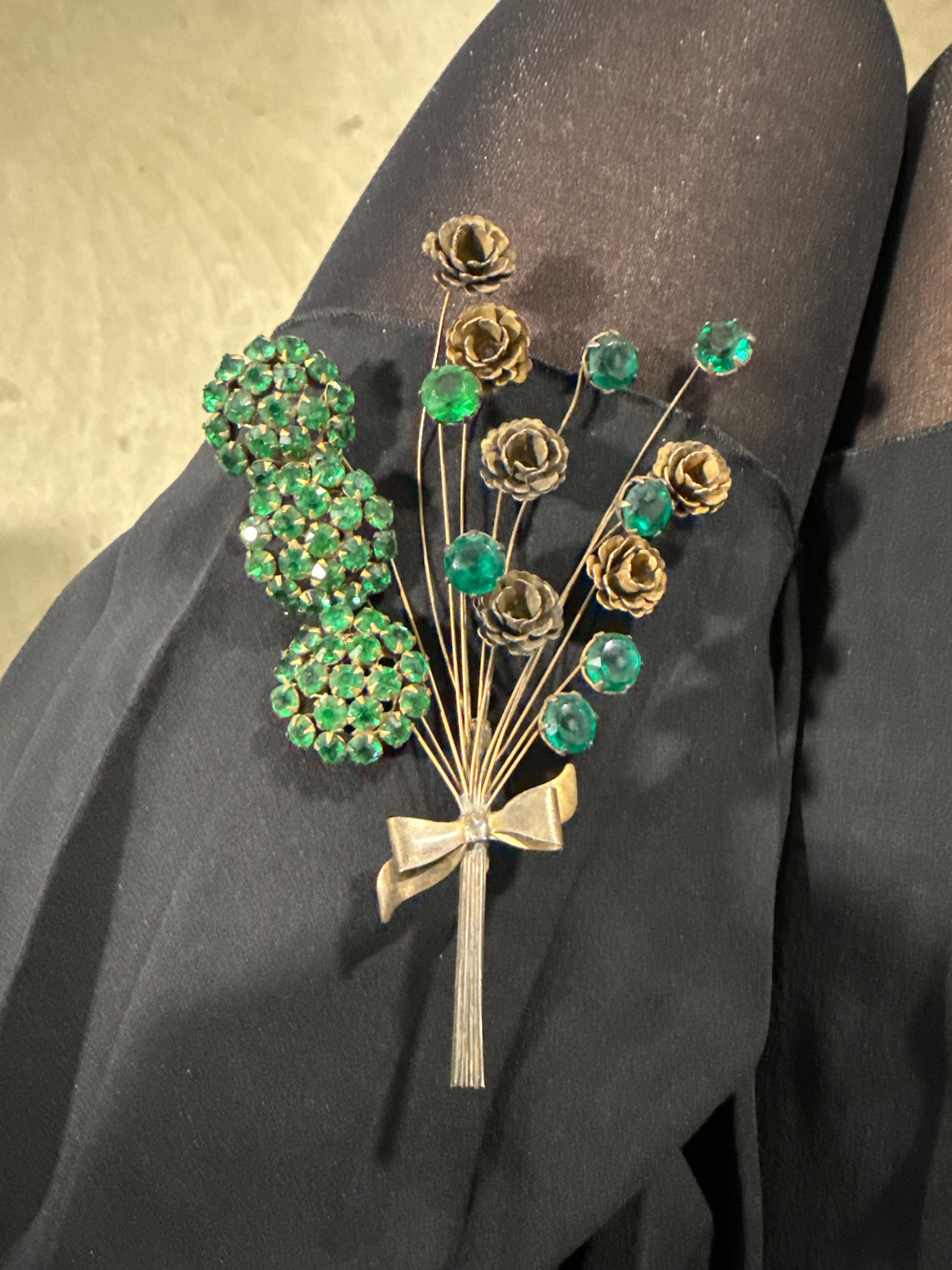 Emerald Nocturne Bouquet is a striking mid-century floral spray brooch that feels both romantic and architectural. A cascade of green rhinestone clusters blooms along one side, while delicate gilt stems rise upward into sculpted metal roses and luminous faceted emerald-hued crystals. The bouquet gathers at a satin-finish bow and elongated stem, giving it the presence of something hand-tied and gifted under candlelight. The contrast between the dimensional metal florals and the vivid green sparkle creates movement and depth—this piece doesn’t just sit; it composes.