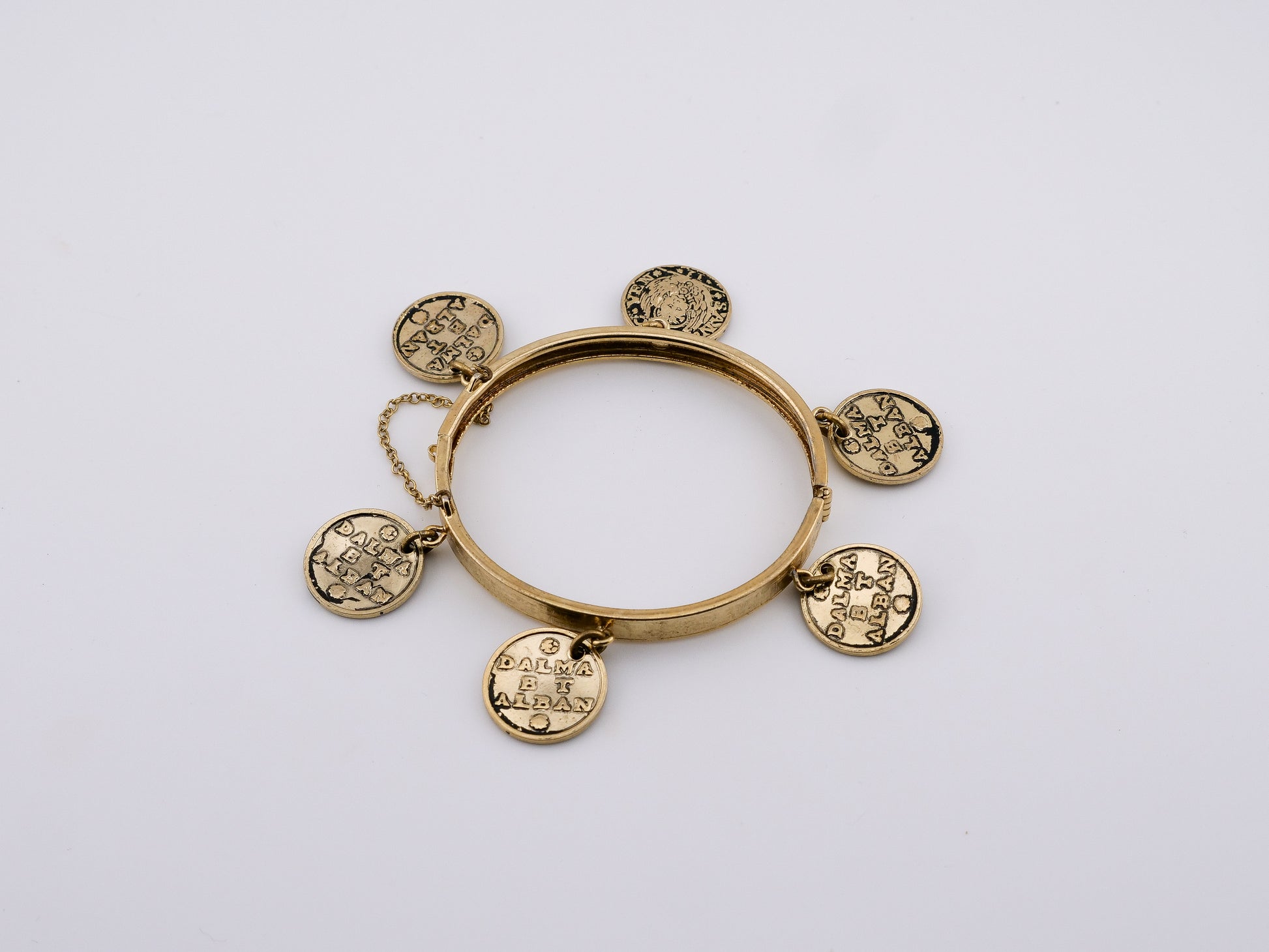 This hinged bangle is adorned with multiple coin-style medallions inspired by Mediterranean and Balkan antiquity, each stamped with the Latin-styled inscription DALMA ET ALBAN, which is a reference to Dalmatia and Albania, regions shaped by centuries of Roman, Byzantine, and Adriatic trade. The charms move freely along the bracelet, producing a soft ceremonial sound that recalls currency worn as protection, status, and identity rather than mere adornment.