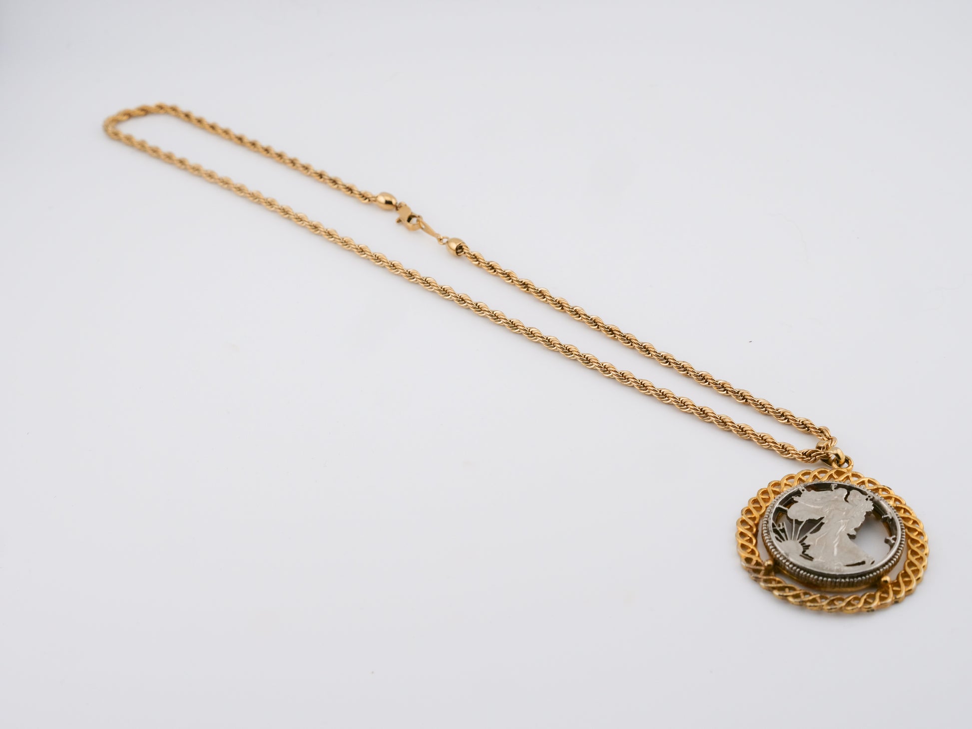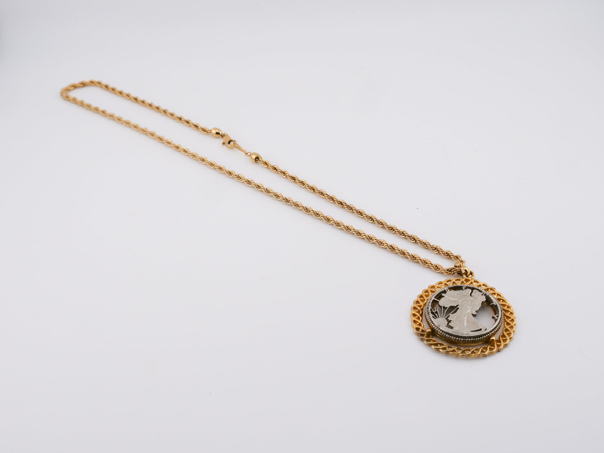 This vintage necklace features a cut 1943 Walking Liberty half dollar, framed in a twisted gold-tone bezel and suspended from a substantial chain. The iconic Liberty figure — originally designed during a time of national resolve — is partially revealed here, creating a piece that feels both historical and rebellious. The cut coin transforms a symbol of tradition into something more personal, more intimate — a reminder that legacy is often reshaped by the hands that carry it forward.