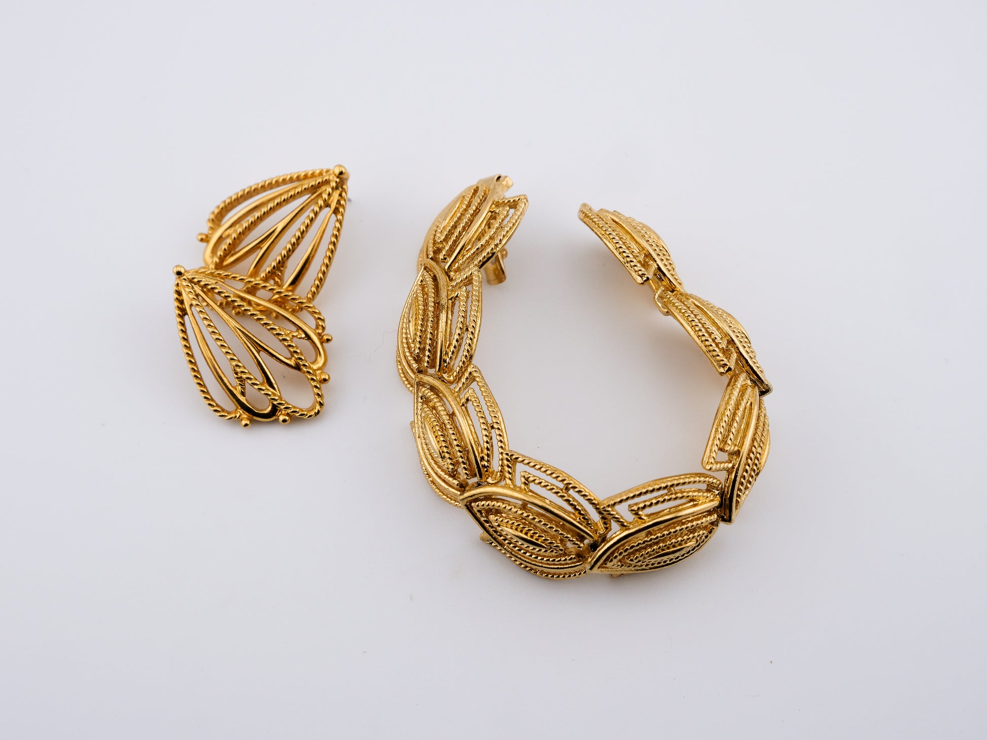 A mid-century Napier woven masterpiece, this gold-tone parure features a linked bracelet and matching earrings in an elegant leaf-and-petal motif. Each piece captures the refined geometry of the 1950s and early 1960s — sculptural, feminine, and effortlessly polished. The rope-textured detailing catches the light like spun sunlight, while the openwork design gives the set a sense of air and movement. A timeless nod to the women who made elegance look easy.