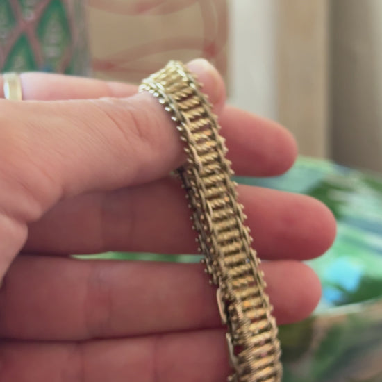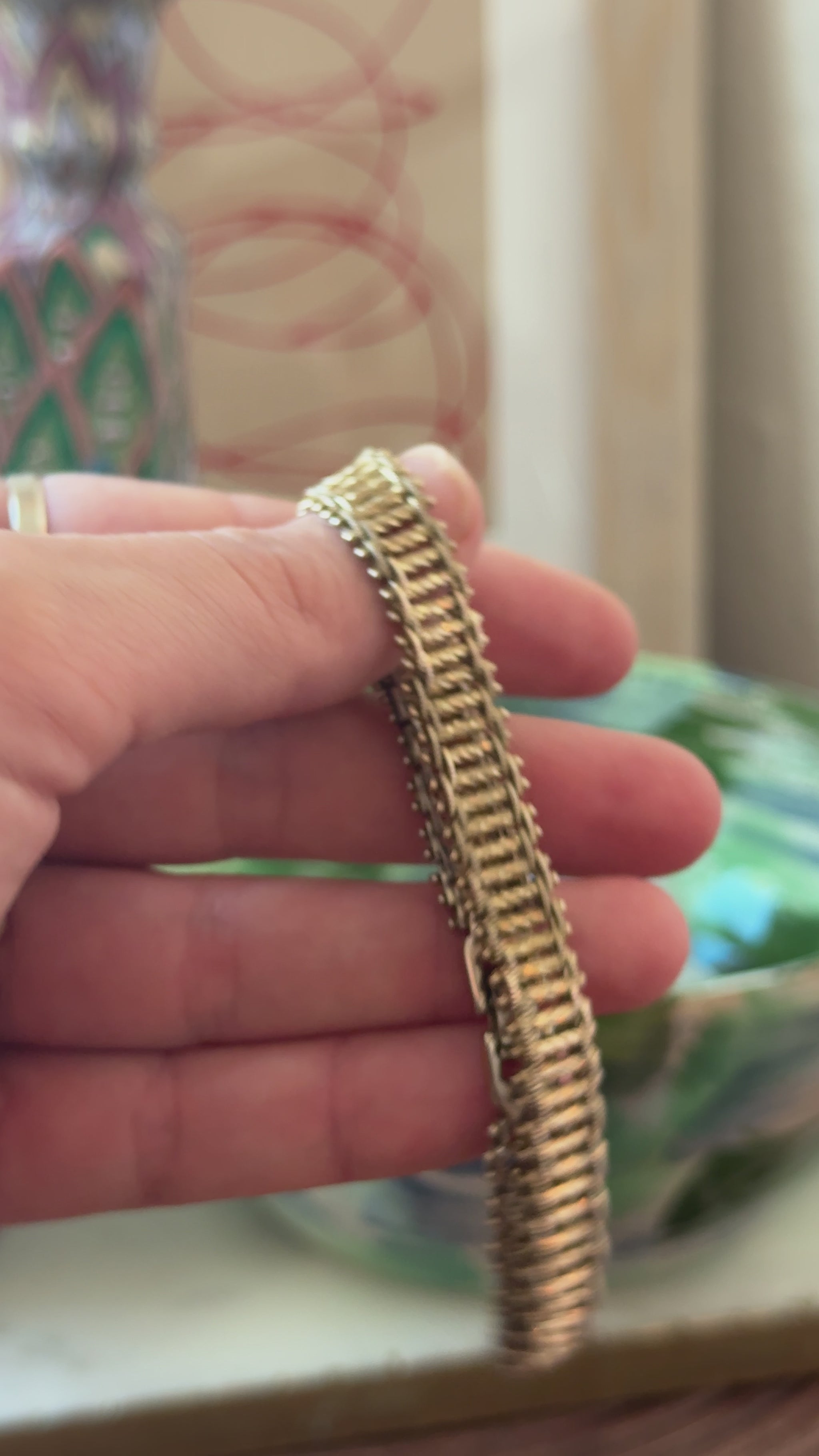 Like sunlight woven into metal, Golden Lattice is a study in craftsmanship and quiet confidence. Each rectangular link features a textured, engine-turned surface framed by delicate beaded edges — a design that bridges strength and elegance with perfect symmetry. The substantial weight and intricate construction suggest mid-century workmanship, when even unmarked pieces were made with care meant to endure.