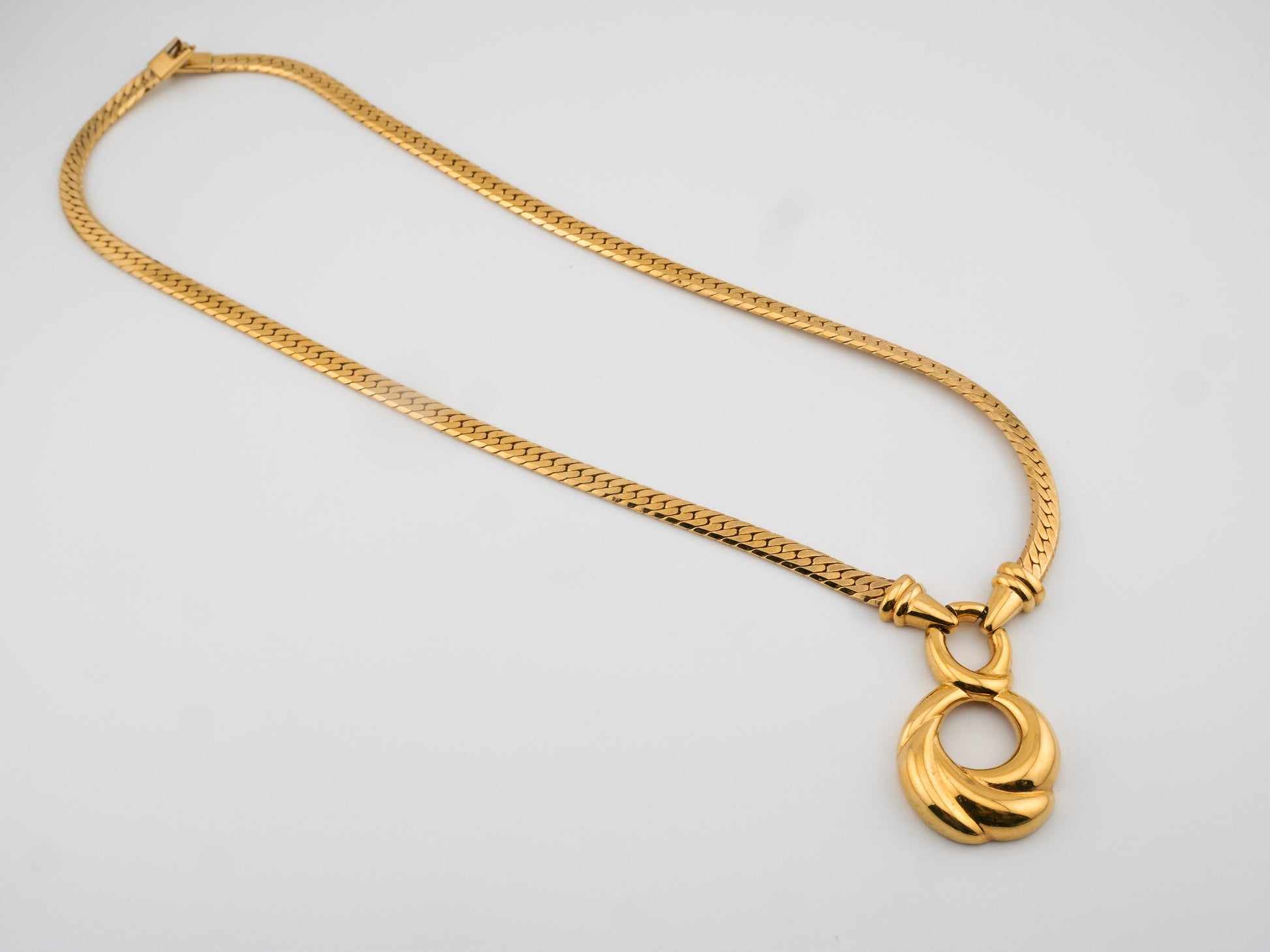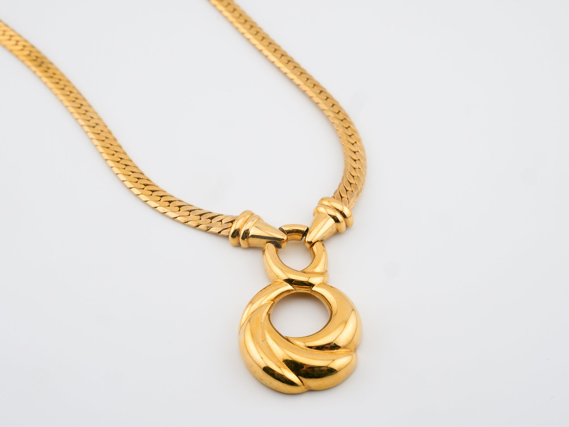 This vintage Napier necklace, aptly named Golden Orbit, carries the bold, space-age confidence of mid-century design. A gleaming gold-tone herringbone chain holds a sculptural circular pendant - a fluid loop that seems to move in eternal rotation, as if tracing the path of a planet around its sun. Napier was known for creating striking statement pieces, and this one is no exception: sleek yet dimensional, it’s jewelry that feels like motion itself, an orbit you step into when you fasten it around your neck.