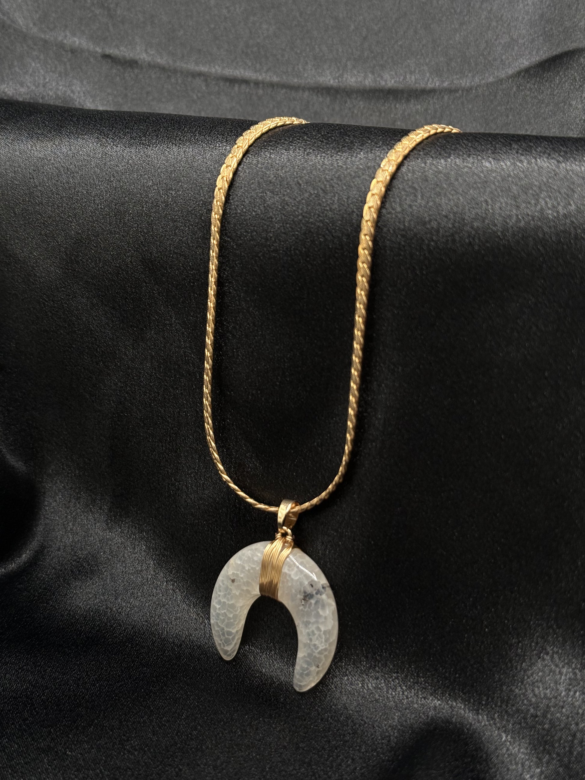 A sleek embodiment of lunar magic and high priestess energy, Selene Rising is a vintage gold-tone flat curb chain with subtle texture that glimmers with every movement. At its center rests a clear quartz crescent talisman—pure, luminous, and divinely feminine. The necklace’s bold yet elegant design recalls the quiet authority of moonlit rituals and ancient goddesses. Whether worn layered or alone, it speaks of power that doesn’t need to shout.