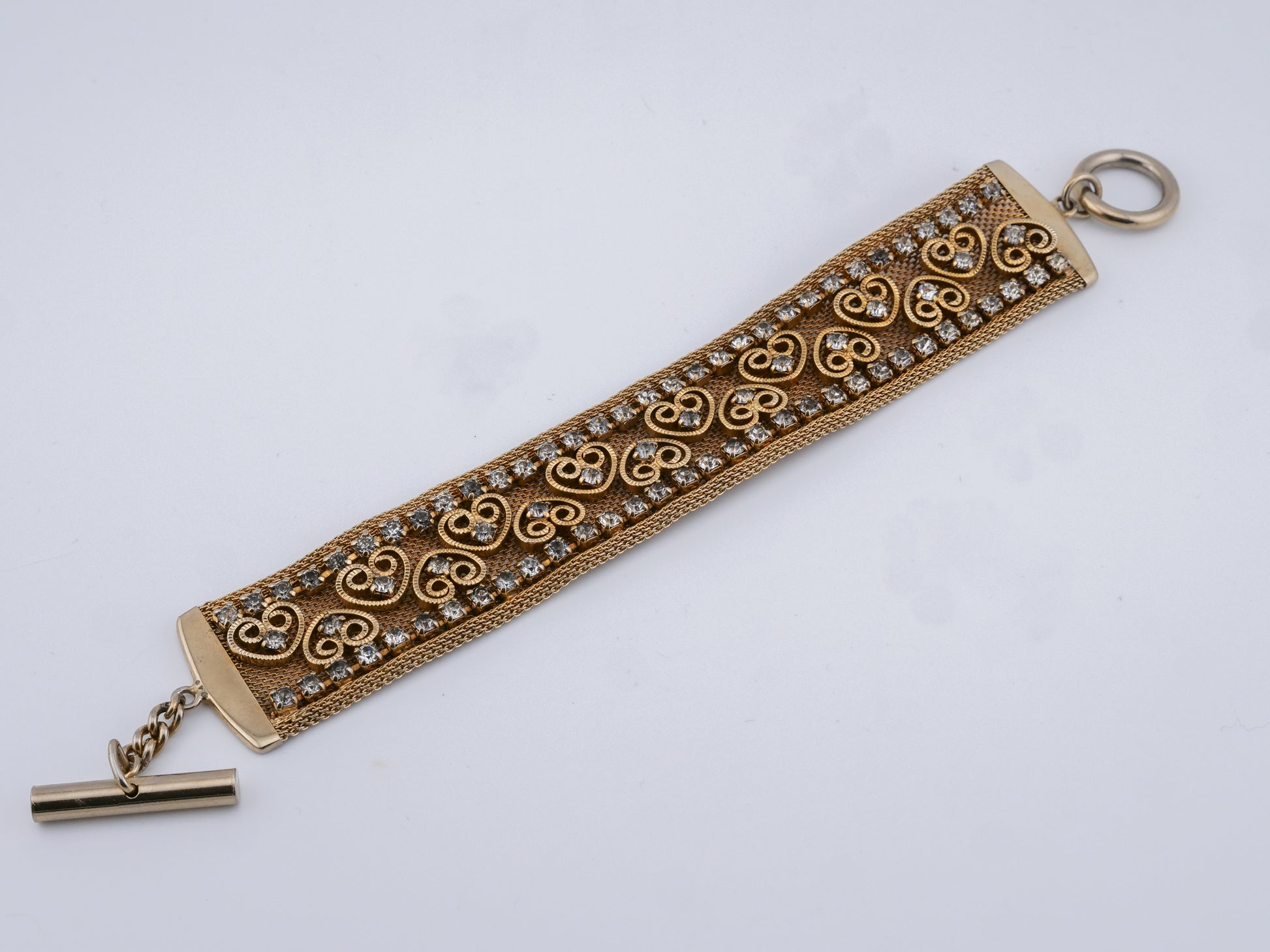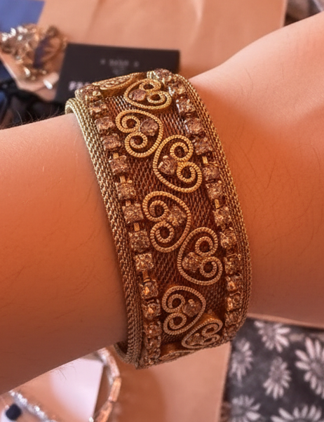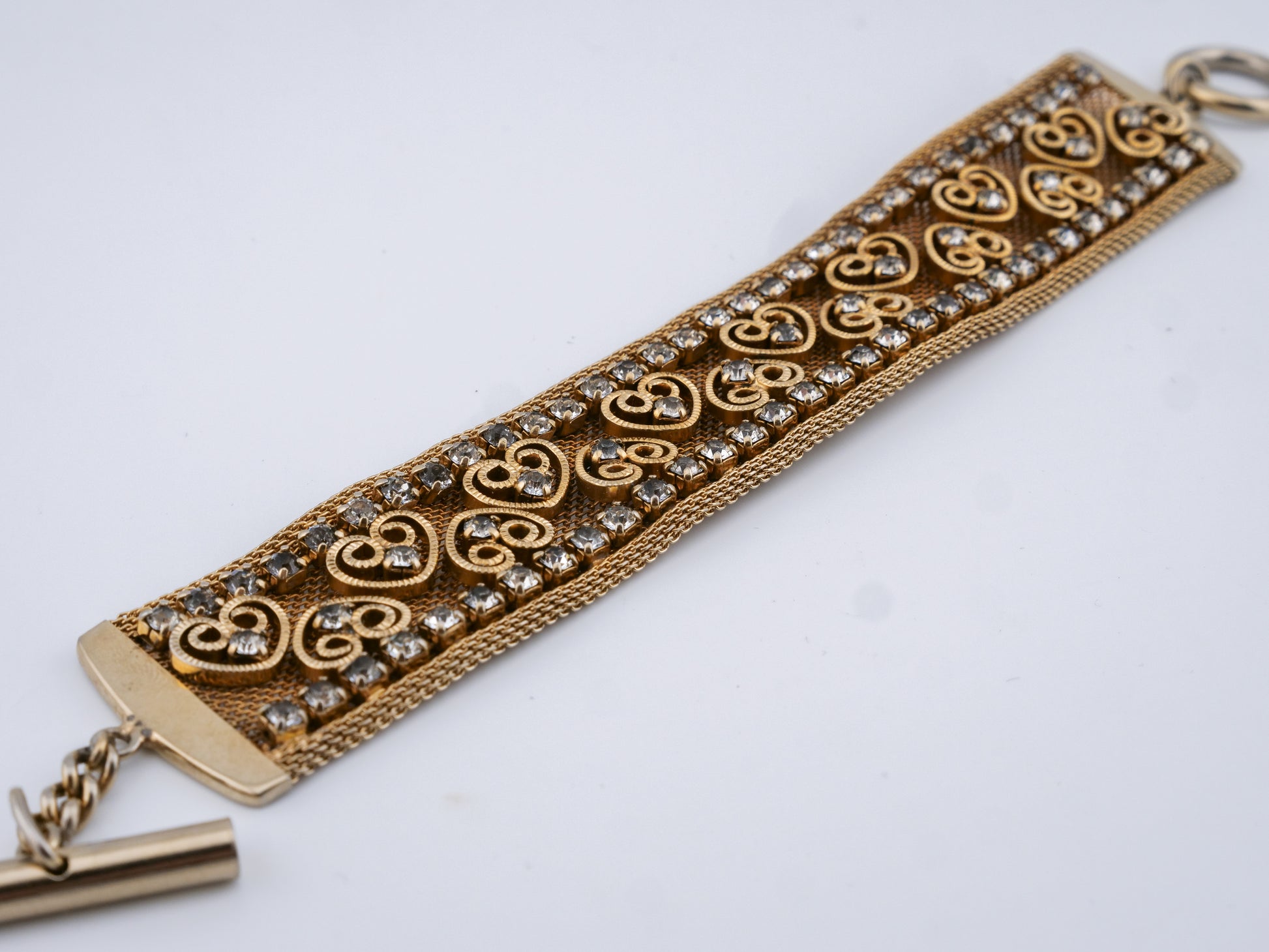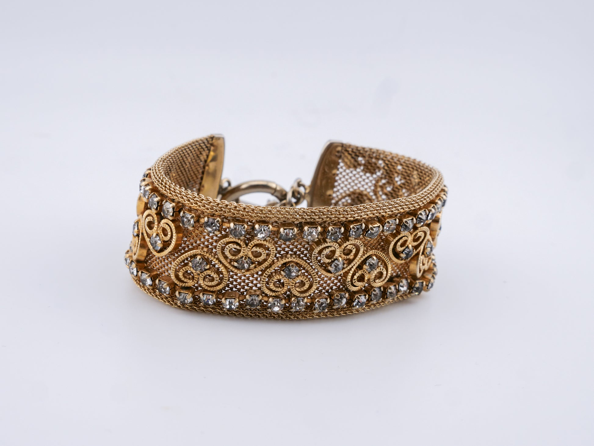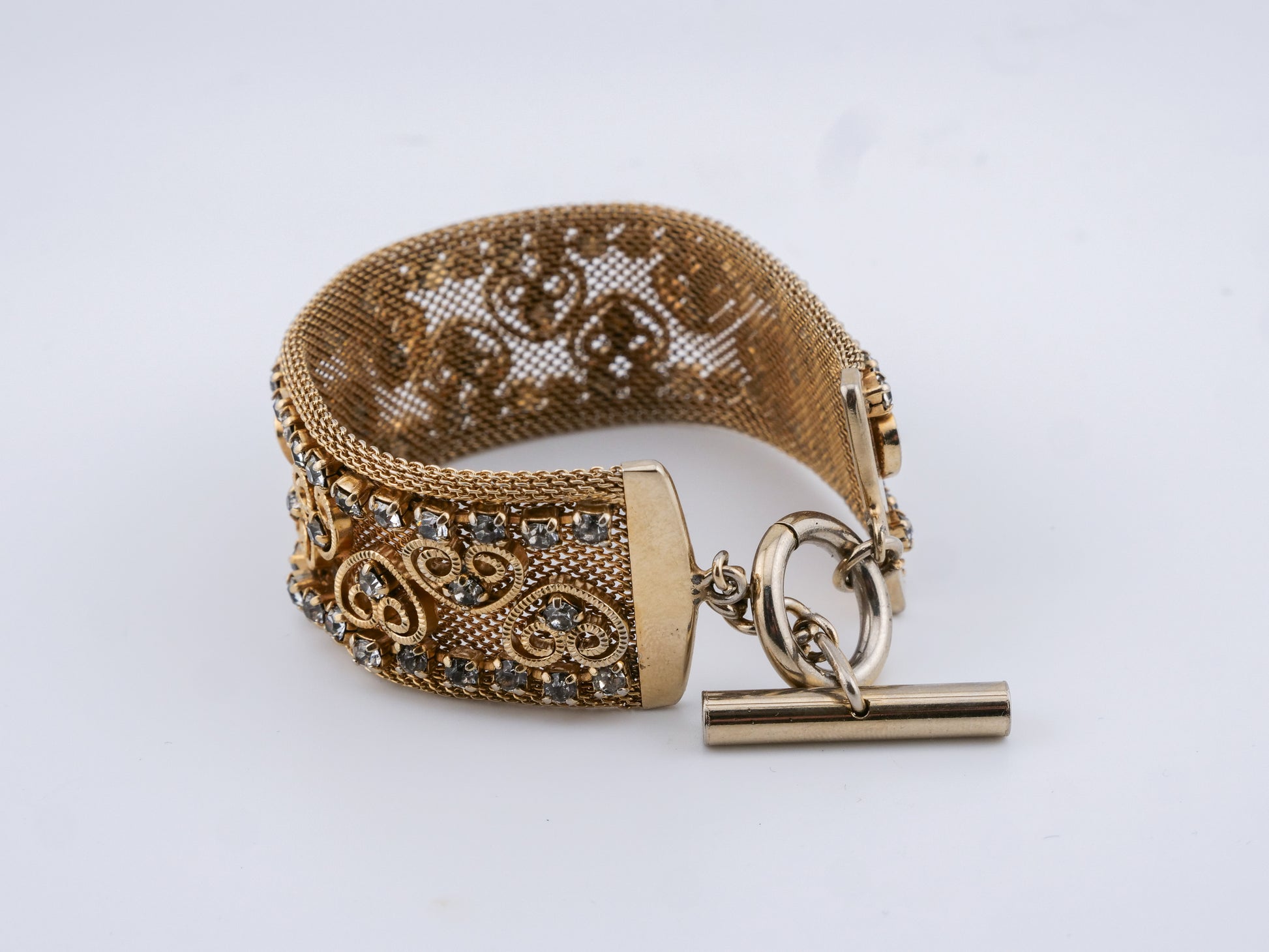 An ornate vintage bracelet alive with Old World grandeur — filigreed hearts of golden bronze rest within a lattice of mesh and crystal. Every curve and shimmer recalls the opulence of Byzantine craftsmanship, where love and devotion were expressed through intricate metalwork. This piece feels like something a queen might have worn in secret — sentimental, radiant, and impossibly rare.