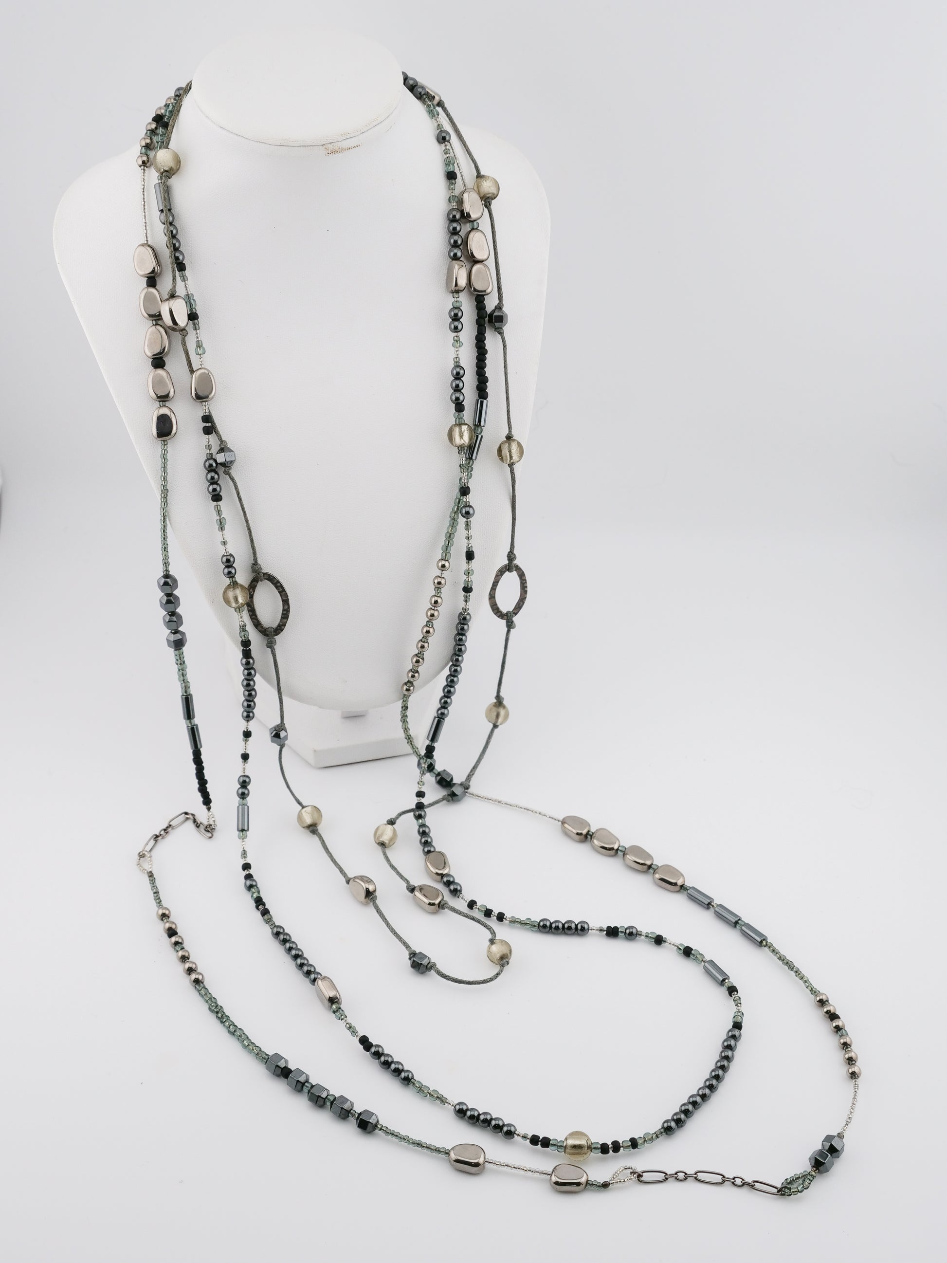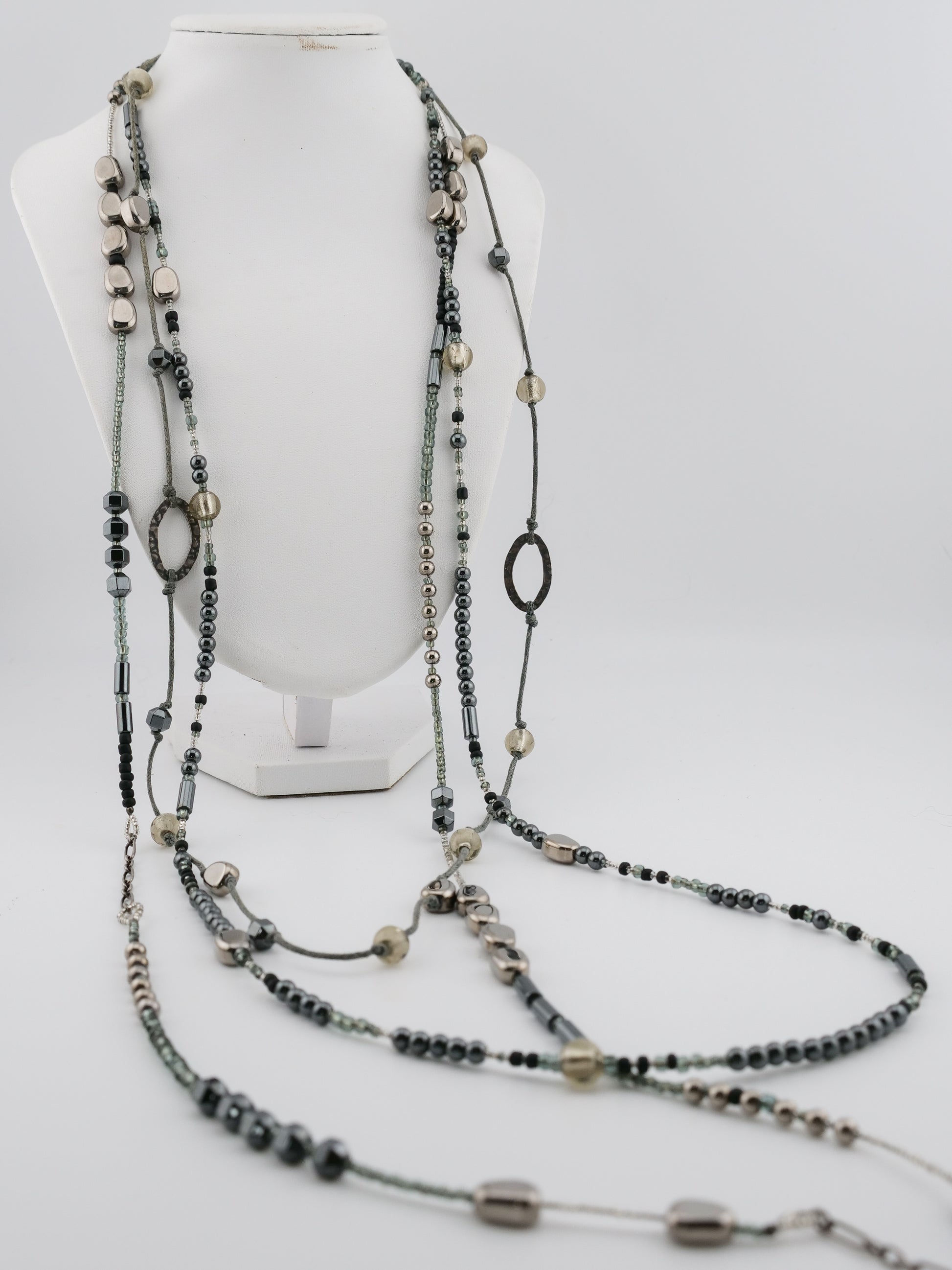 This striking multi-strand necklace by Silpada, a vintage favorite, layers hematite beads with sterling silver (925) elements in an effortlessly architectural way. The palette is deep charcoal, steel, and soft silver - cool, grounding, and quietly powerful.
