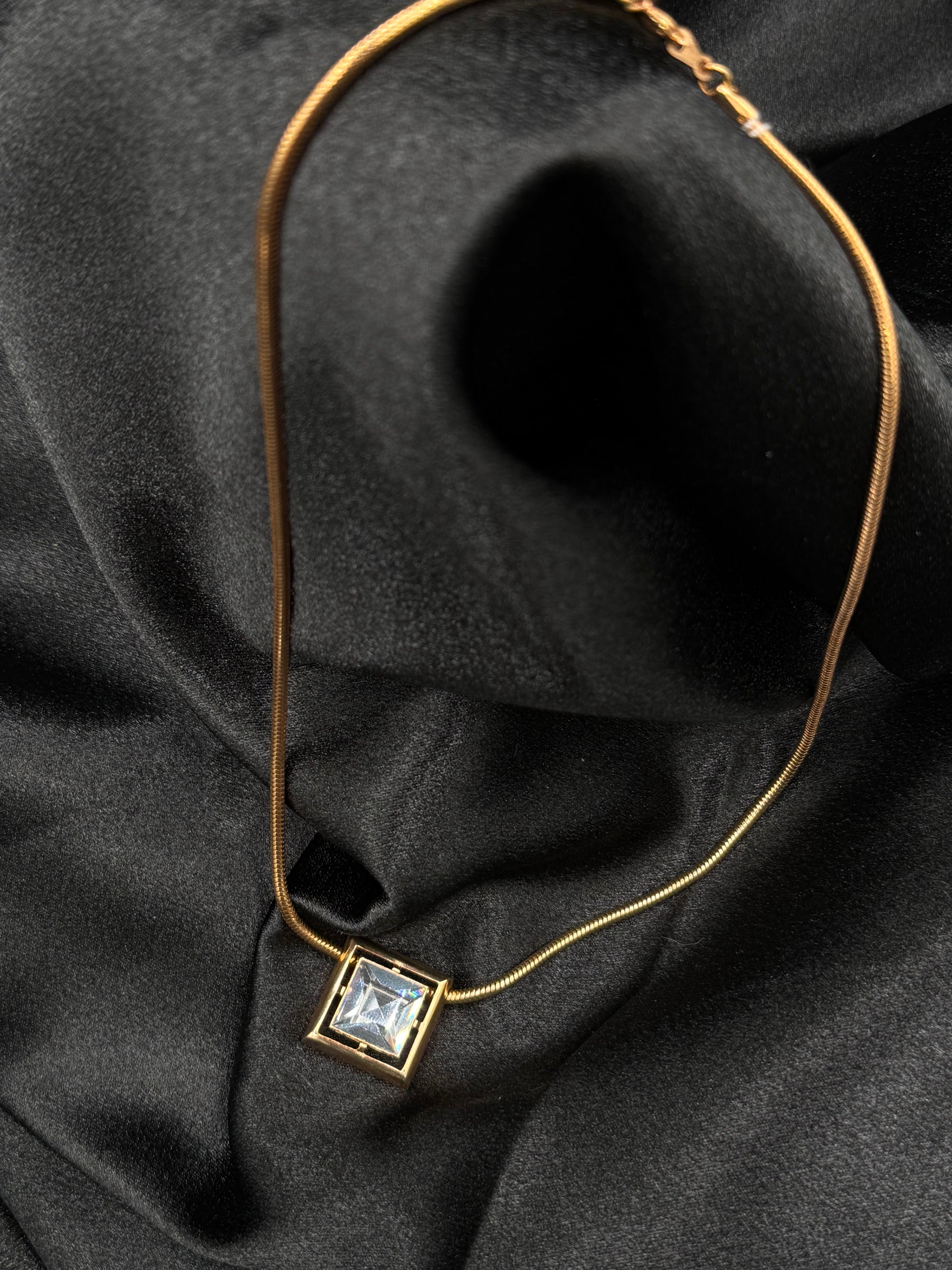 Light Square is clarity incarnate—modern, radiant, and quietly bold. A crisp square-cut crystal rests in a sleek gold bezel, suspended from a golden snake chain that feels more like sculpture than jewelry. It’s minimalist without being cold, with just the right amount of flash to catch the eye. The kind of piece you wear when you want your power to speak without saying a word.