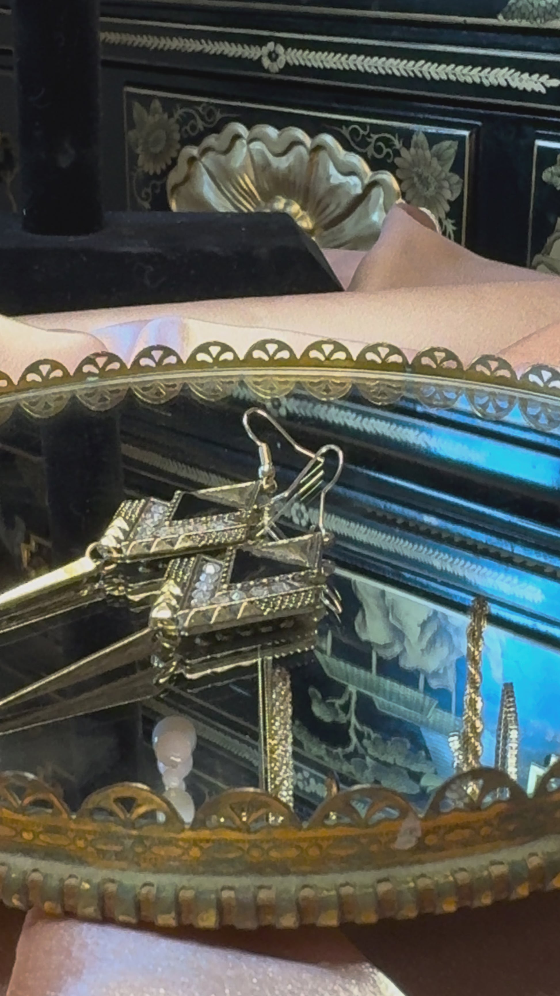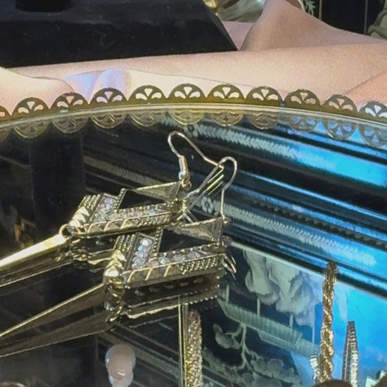 The Midnight Arrows earrings strike with power and precision. Featuring glossy black triangular stones framed in silver-tone metal, accented with rows of sparkling crystals and studded details, these earrings embody both strength and drama. The long arrow-like dangles add movement and a sharp finish, making them an unmistakable statement piece.