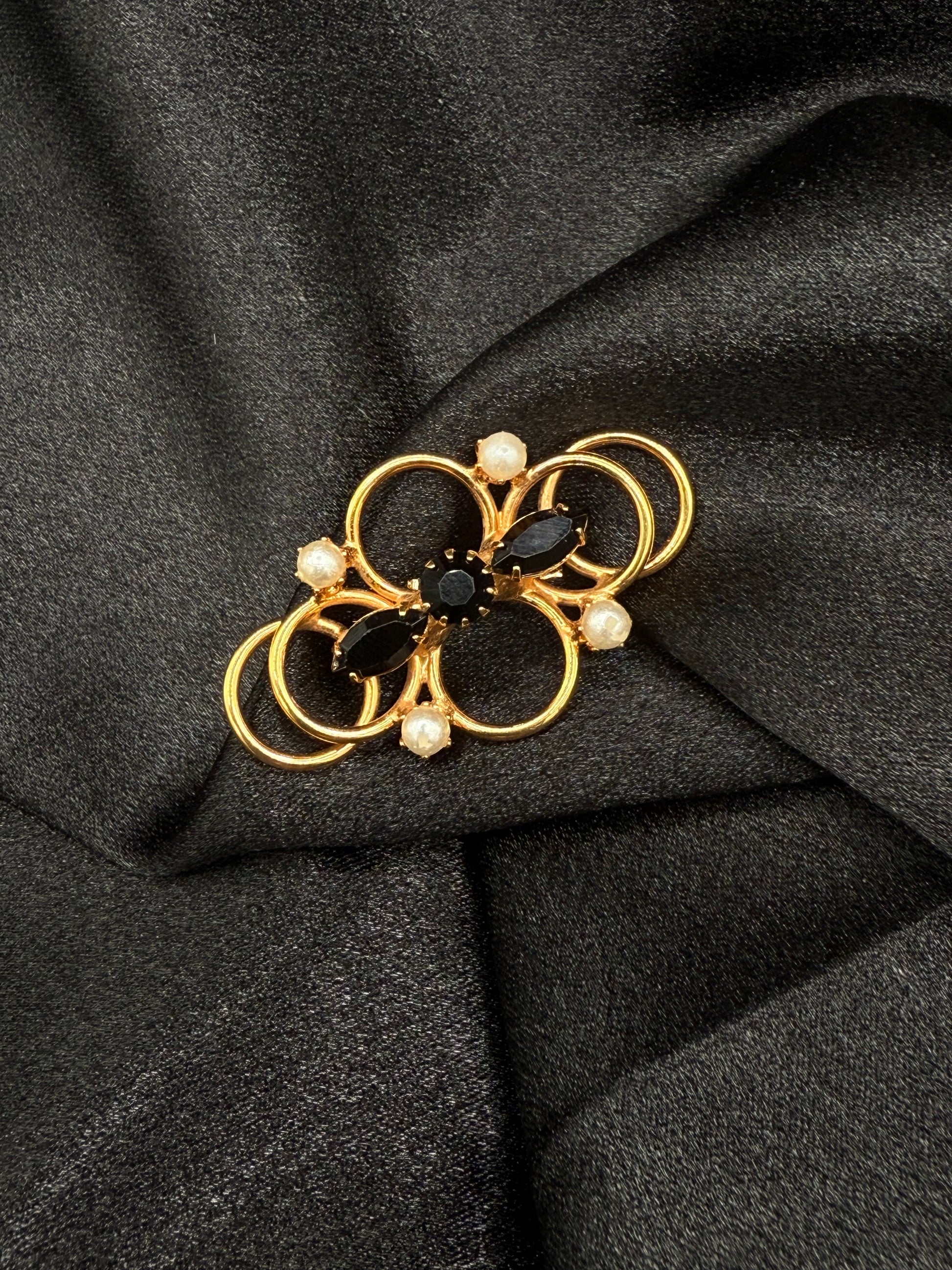 Midnight Orbit is where cosmic symmetry meets vintage drama. Gold-tone loops spin out from a central black stone, anchored by jet-like marquise accents and four glowing faux pearls. It’s part atomic age, part celestial mourning jewel—a powerful piece that turns any lapel, scarf, or collar into a portal for elegance.