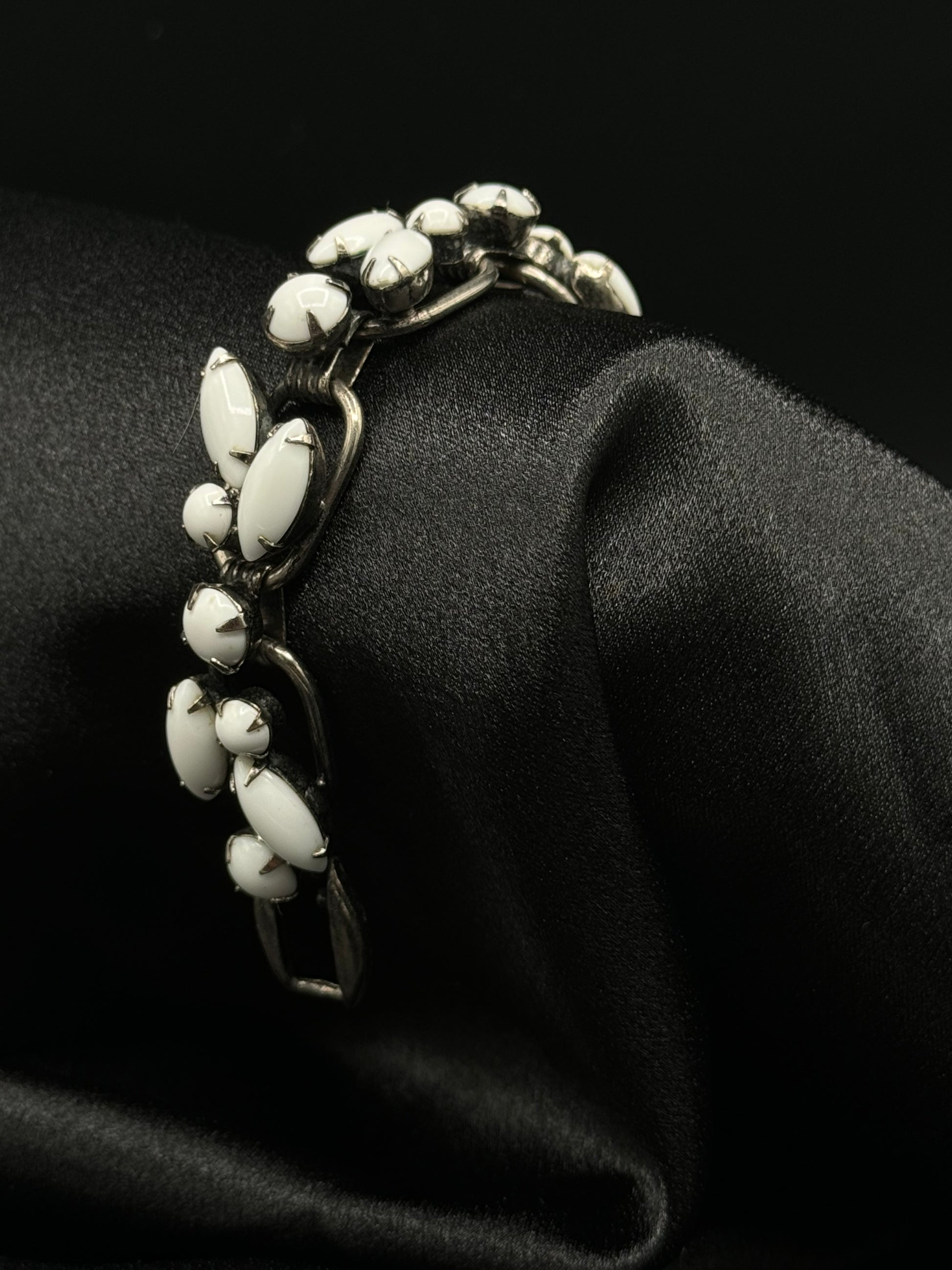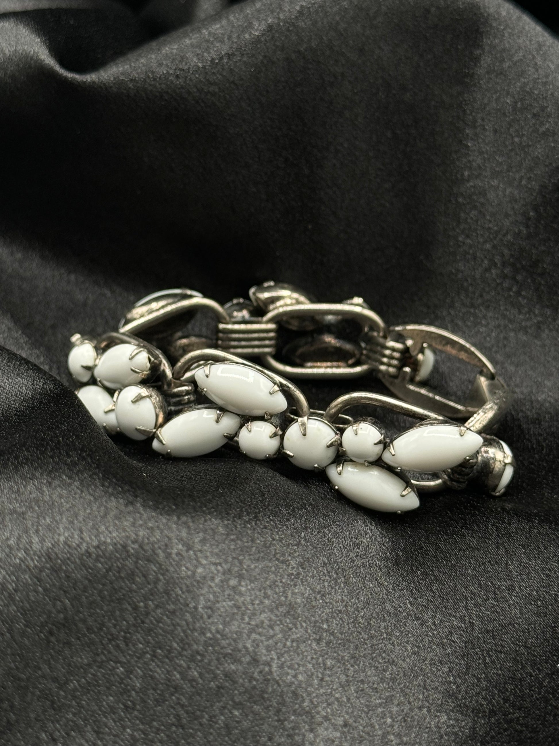 A bold relic from the 1960s, Milky Way is a vintage milk glass bracelet that wraps the wrist in mid-century wonder. Set in silvertone metal, the creamy navette stones radiate like little galaxies, evoking the era’s fascination with space and futuristic femininity. It’s substantial, sculptural, and dreamy—an orbit of nostalgia and stardust.