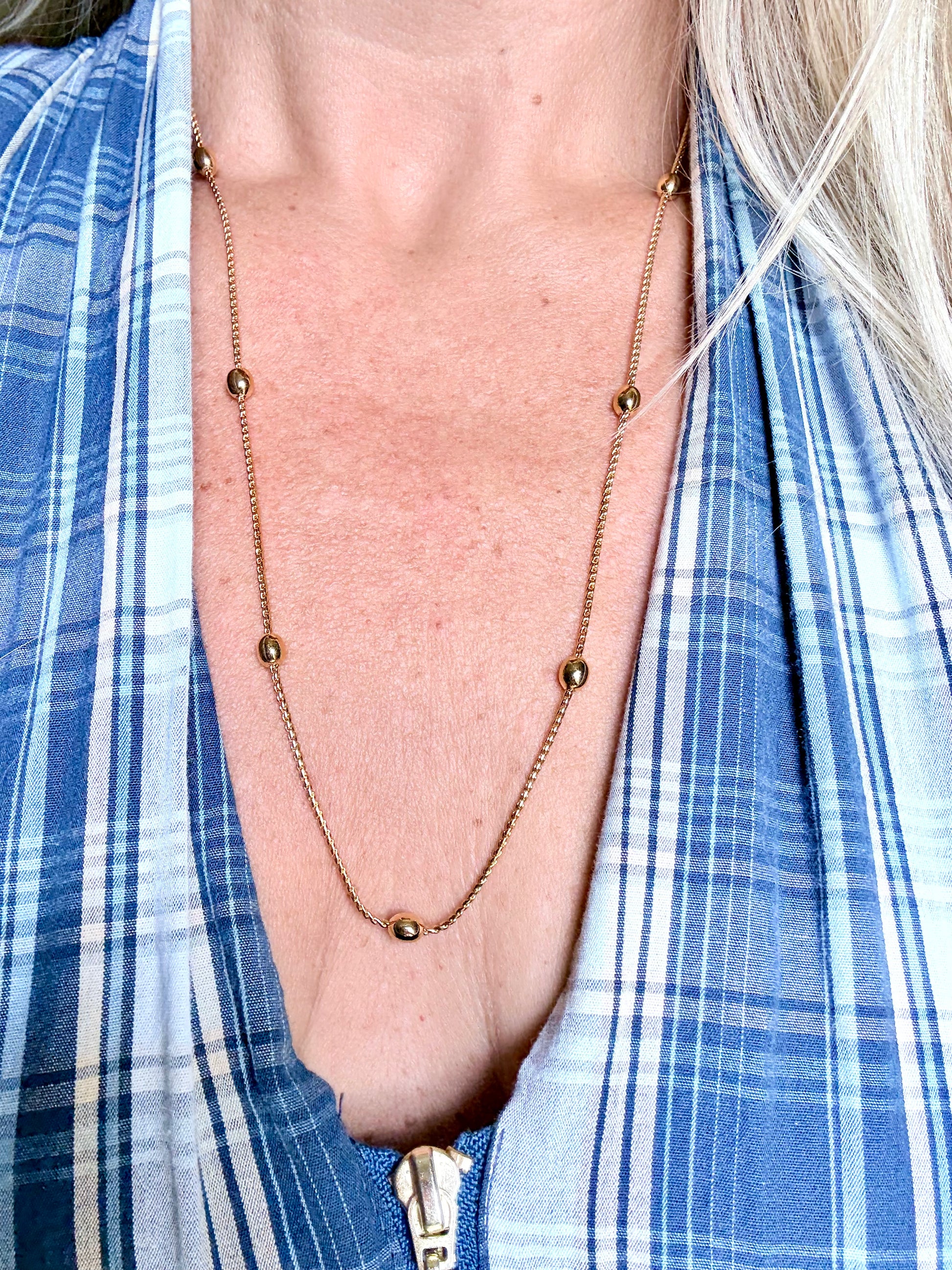 This vintage Monet 24-inch chain necklace is a classic statement in understated elegance. Designed with polished gold-tone beads spaced along a delicate rope chain, it creates an easy rhythm of shimmer and shine. Its versatile length allows it to be worn alone for a refined touch or layered with other pieces for a more dramatic effect. As with all Monet jewelry, the craftsmanship ensures both durability and timeless style.