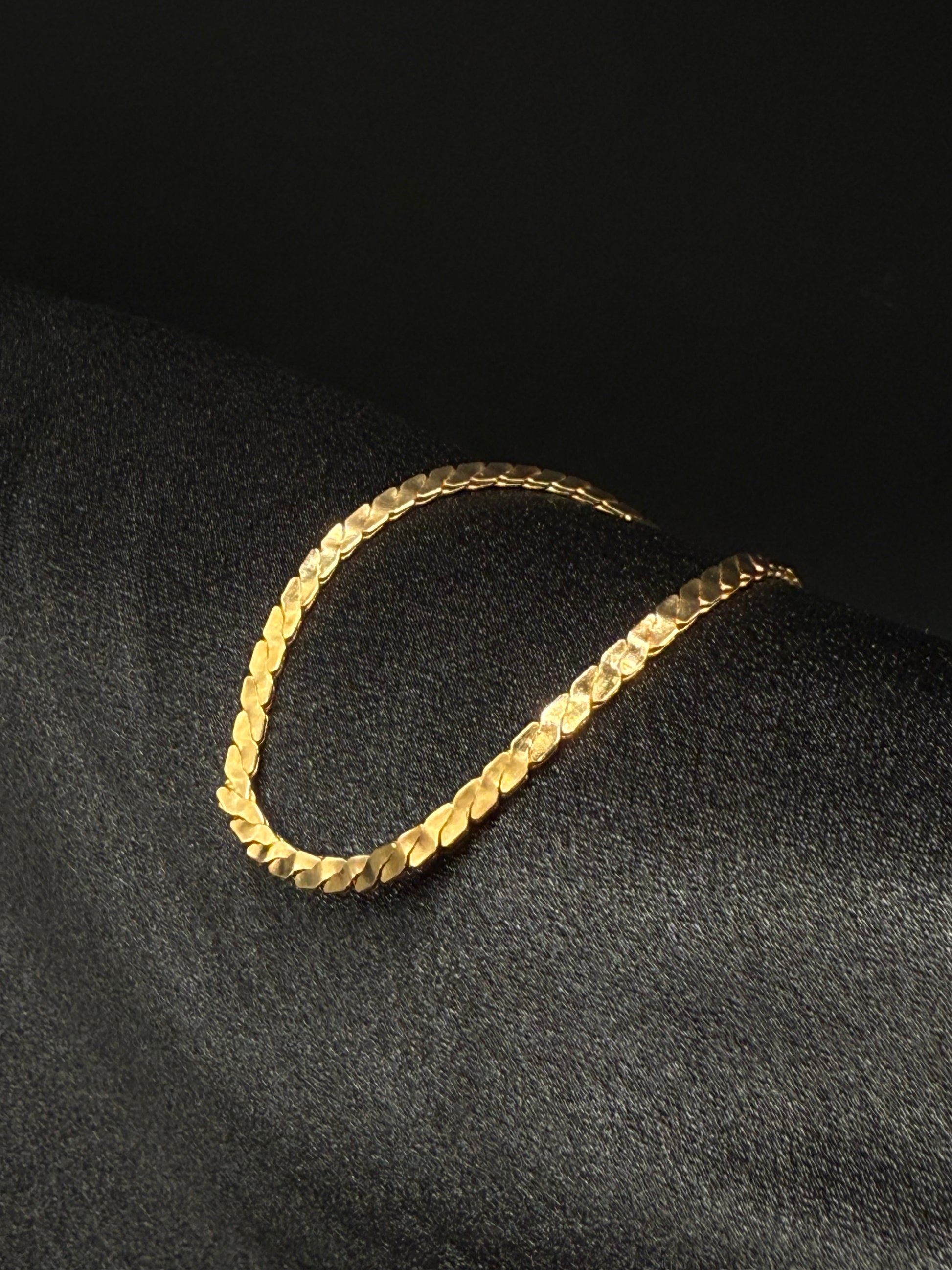 From the iconic Monet brand, Sunshard lives up to its name: faceted like a golden sliver of sun, it flickers and flashes with every movement. Lightweight and classic, this vintage bracelet adds instant polish to anything it graces. The flat diamond-cut links give it a mirror-like sheen, catching light like a secret only you know. Timeless, subtle, and unmistakably chic.