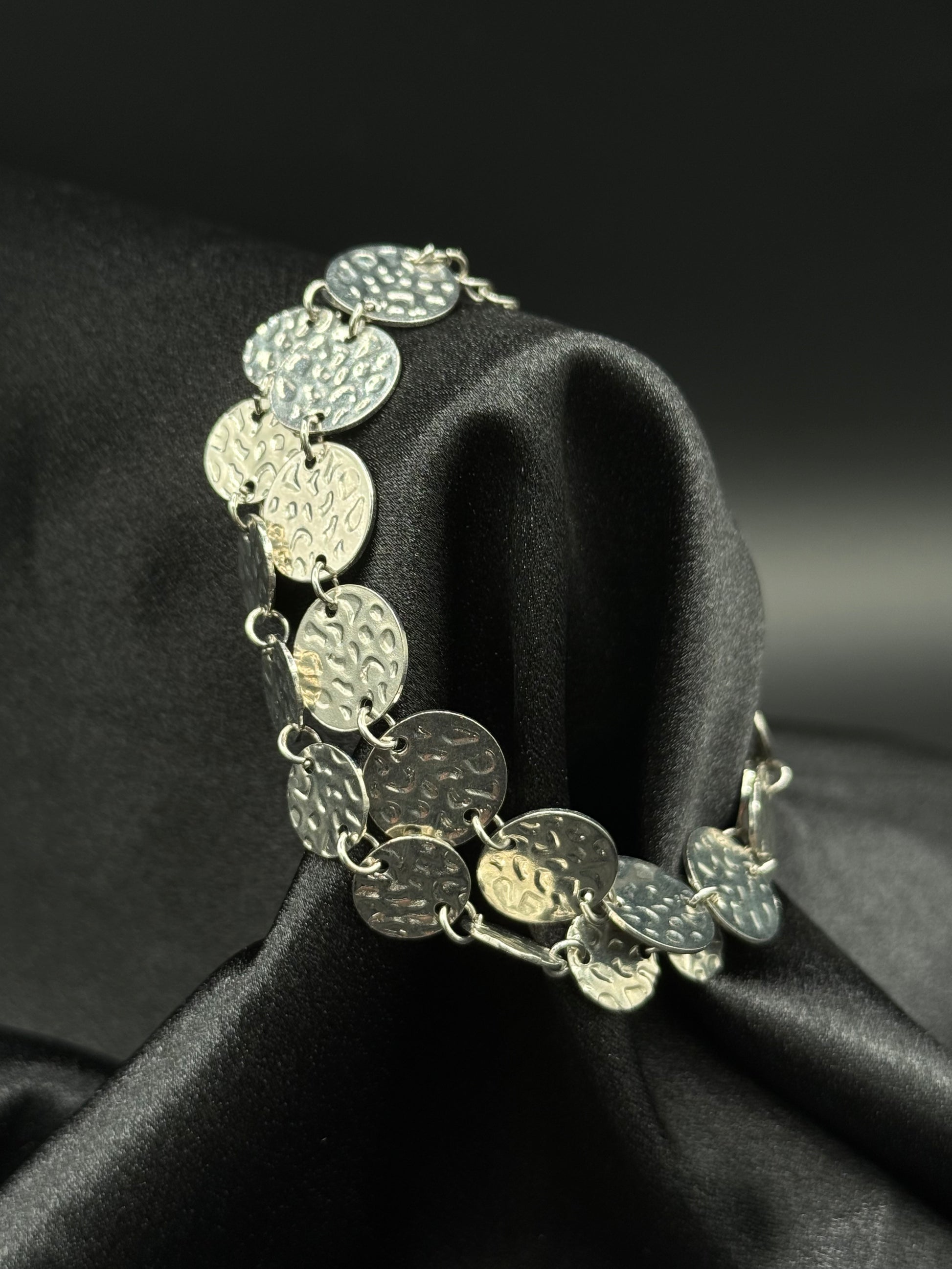 Moon Chant sings when you move. Dozens of hammered silver-tone discs catch the light and jingle with a subtle, sacred rhythm, like coins in a ceremonial dance. Lightweight yet full of presence, this bracelet is meant to be seen, heard, and felt. A wearable invocation for the woman who leads with intention and walks in rhythm with the moon.