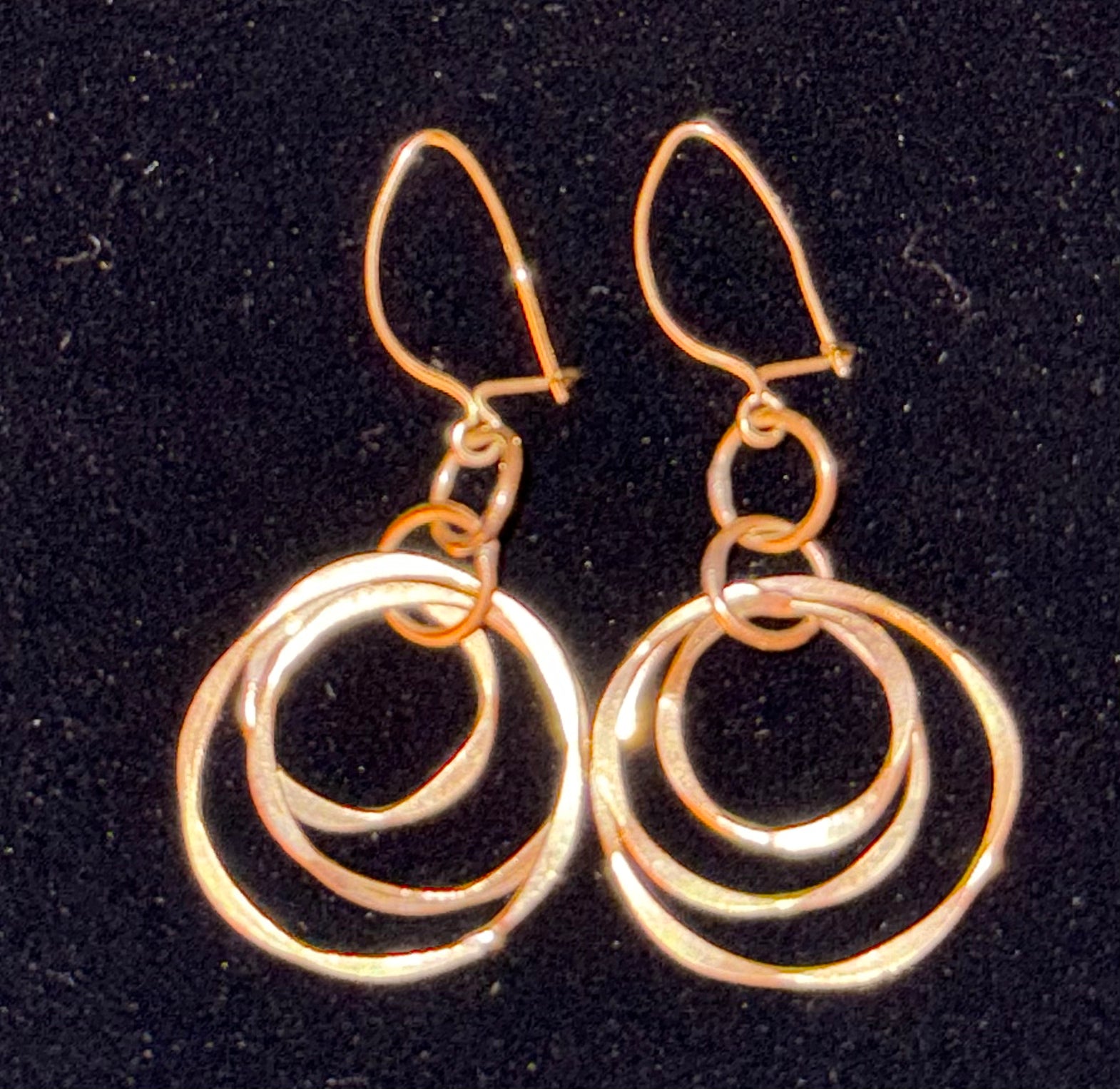 Handmade in warm 10k gold, these earrings are built from a trio of softly imperfect rings that move independently but resolve into a single, harmonious form. The craftsmanship is intentionally honest — not overly polished, not machine-perfect — giving them a quiet, lived-in elegance. As they move, the circles catch light at slightly different angles, creating a subtle glow rather than a flash. They feel intimate and architectural at once: modern, grounded, and deeply wearable. This is the kind of piece that becomes a signature without trying to be one.