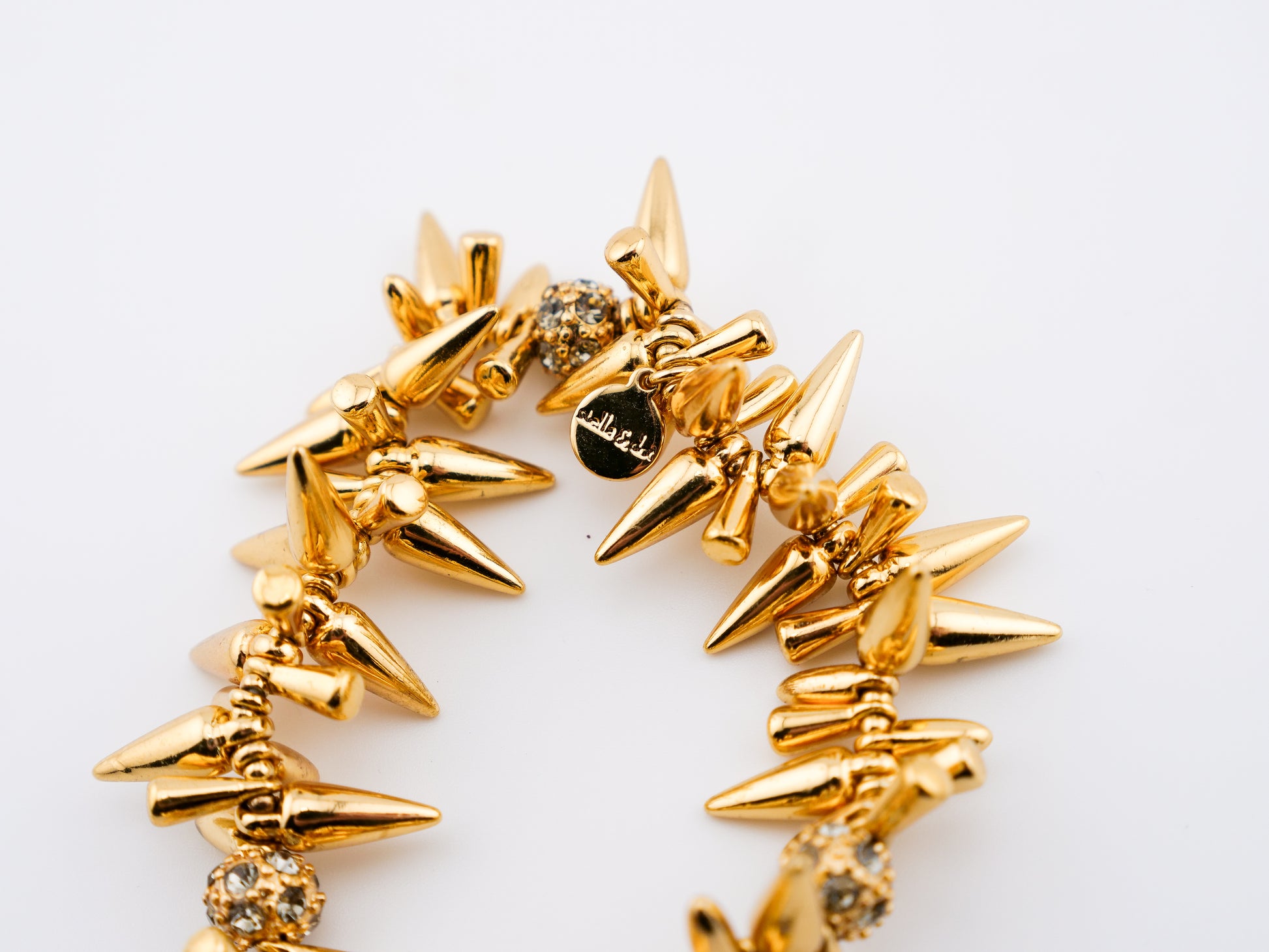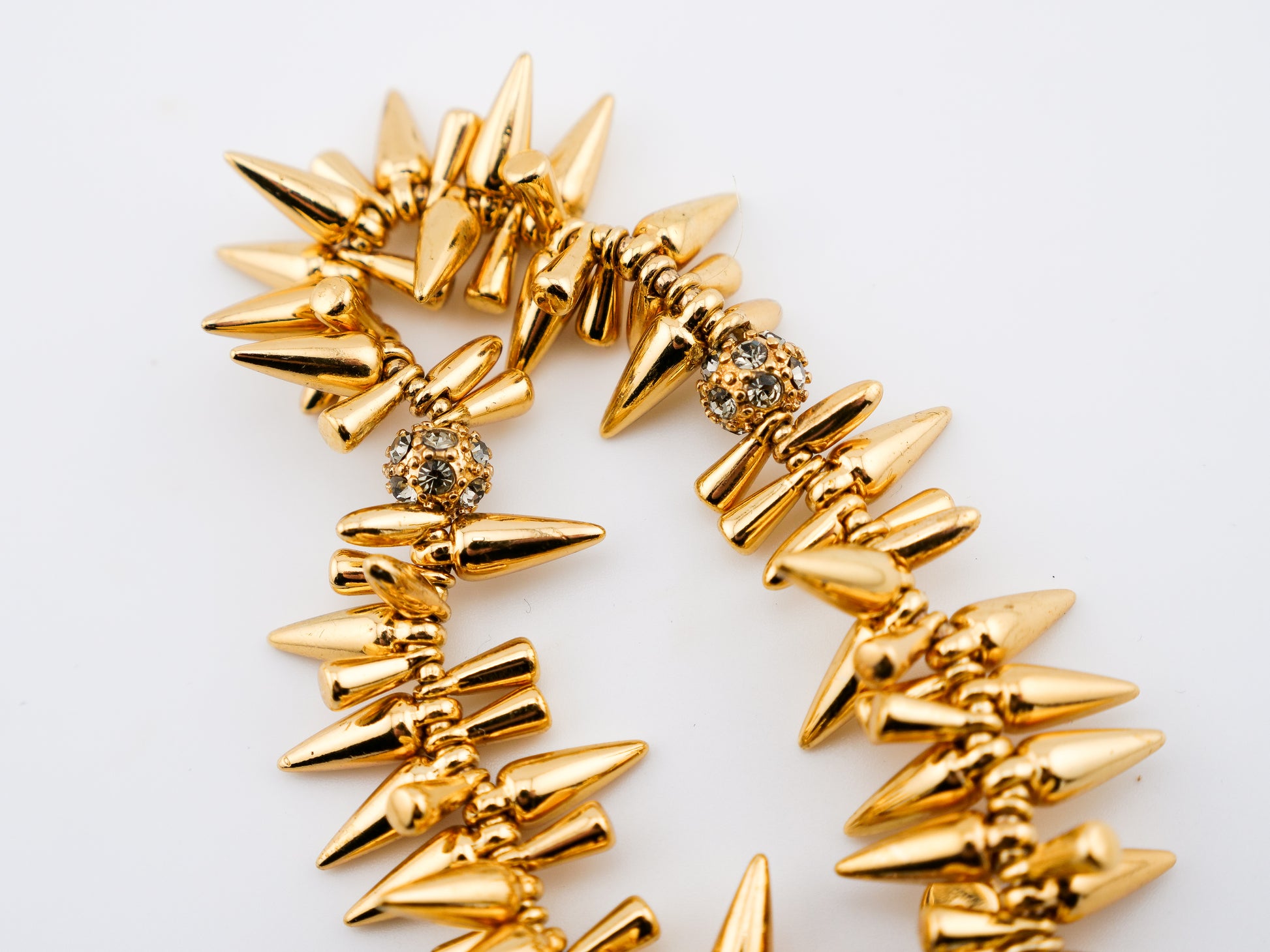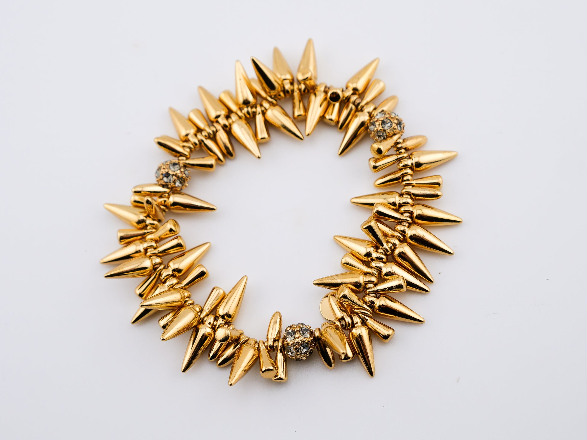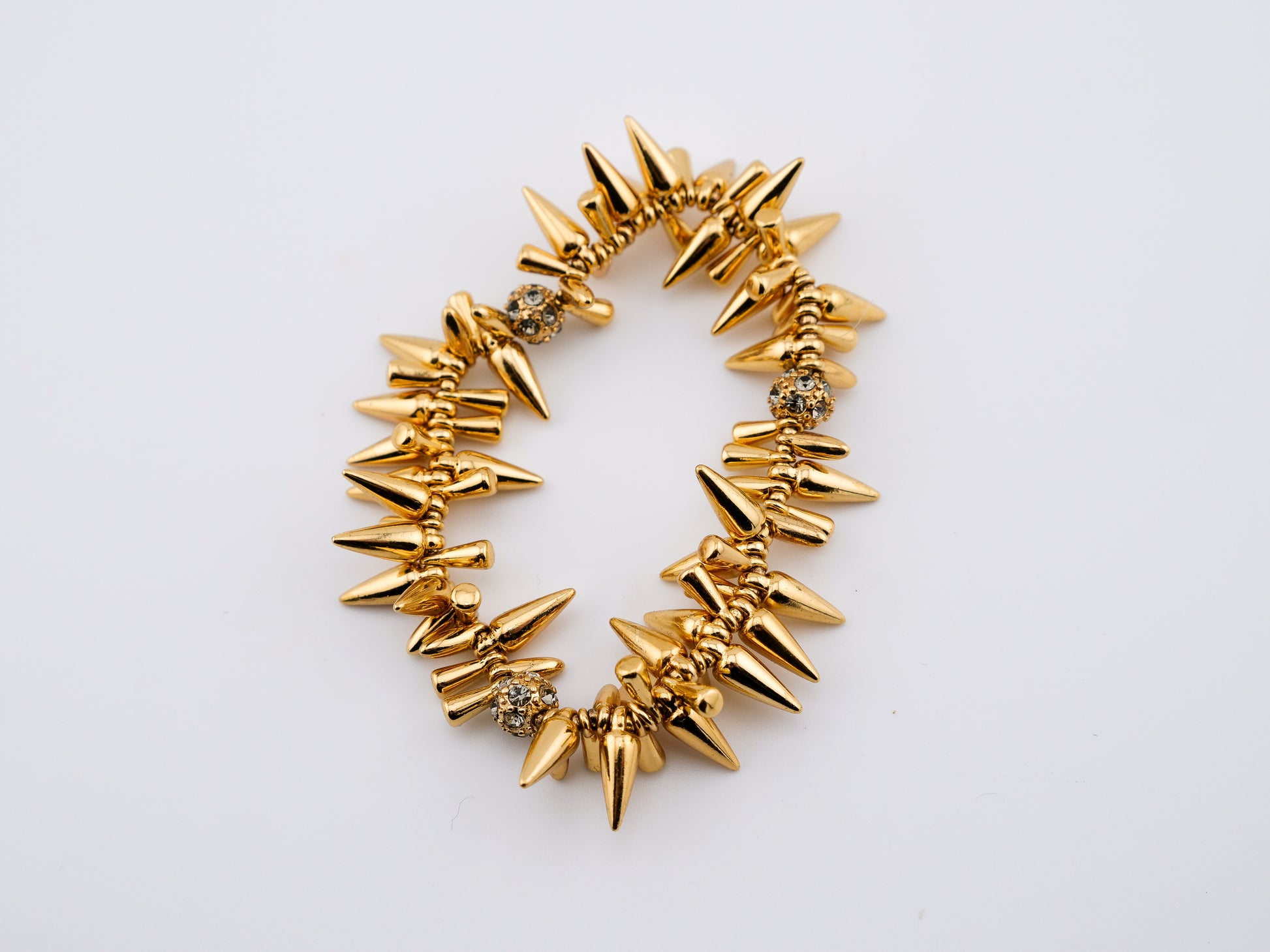 This iconic Stella & Dot stretch bracelet is all edge and sparkle—layered gold-tone spikes punctuated by flashes of crystal that catch the light with every movement. It’s bold without being heavy, dramatic without trying too hard.