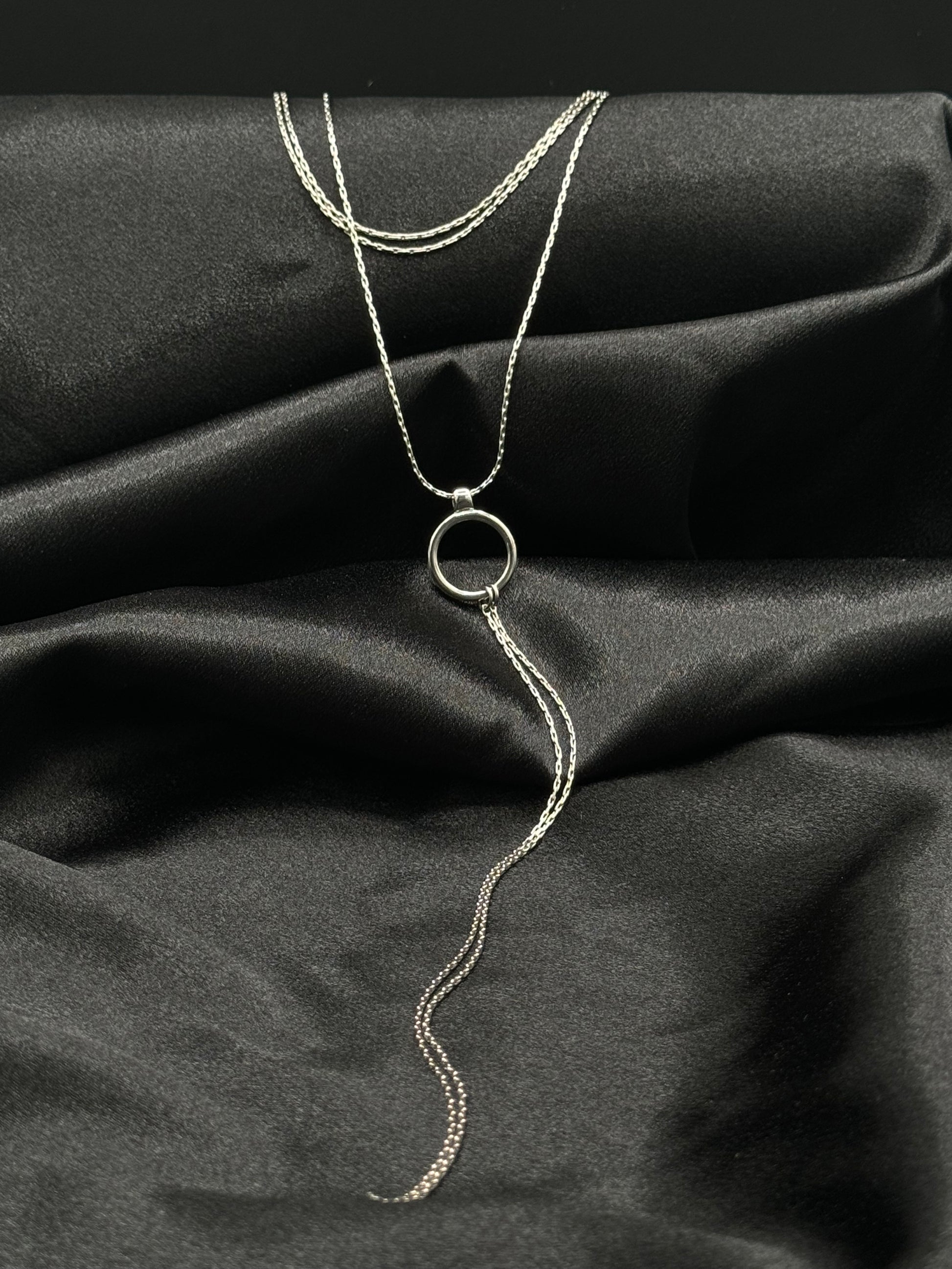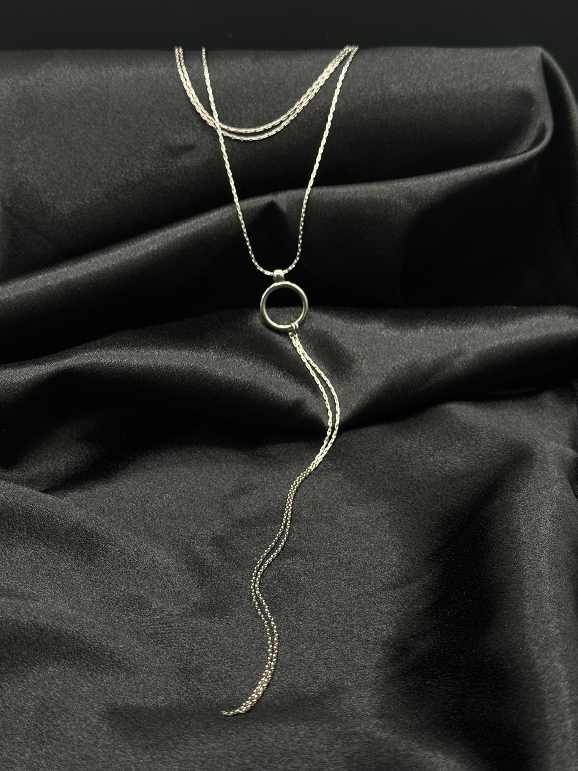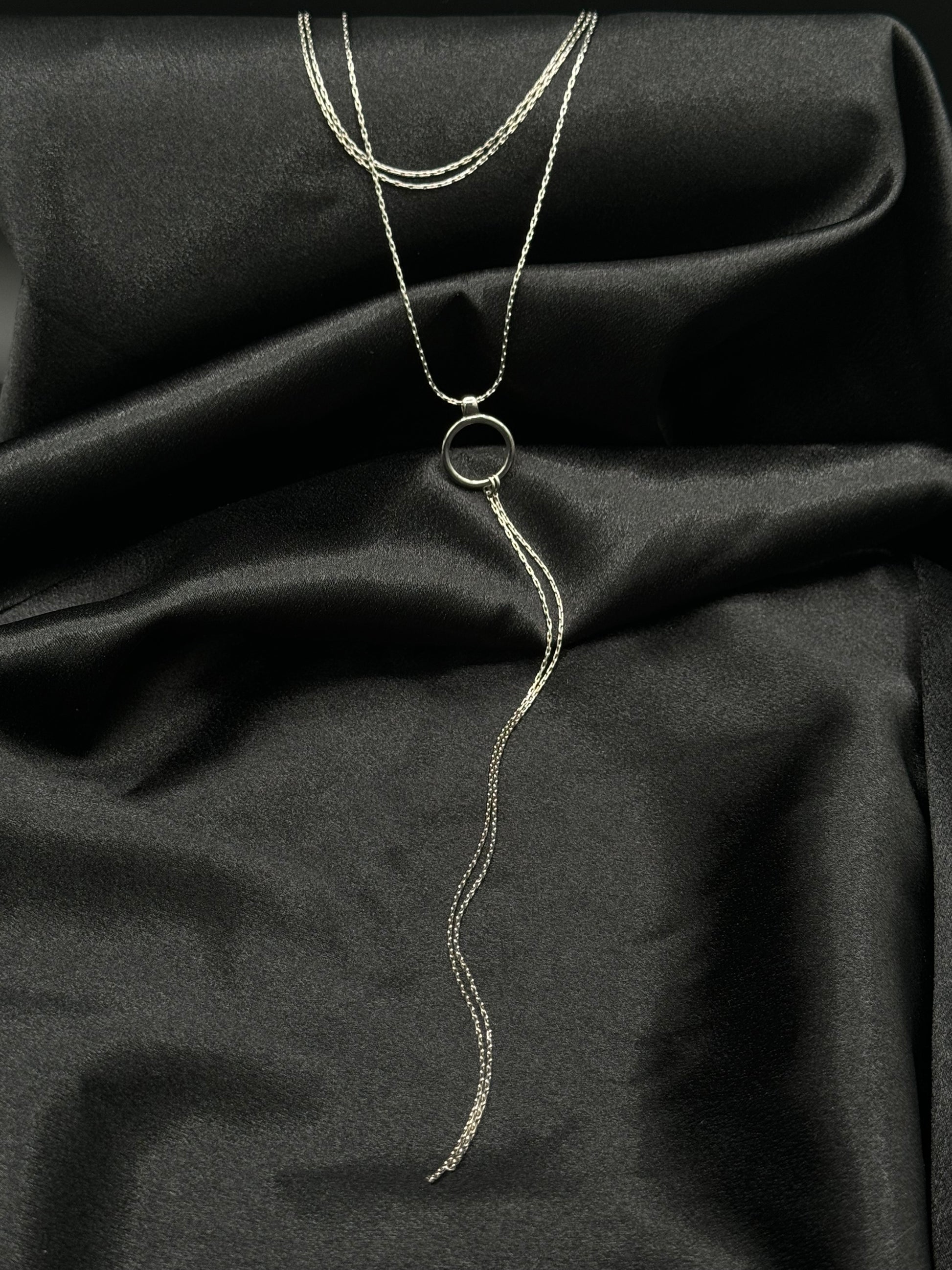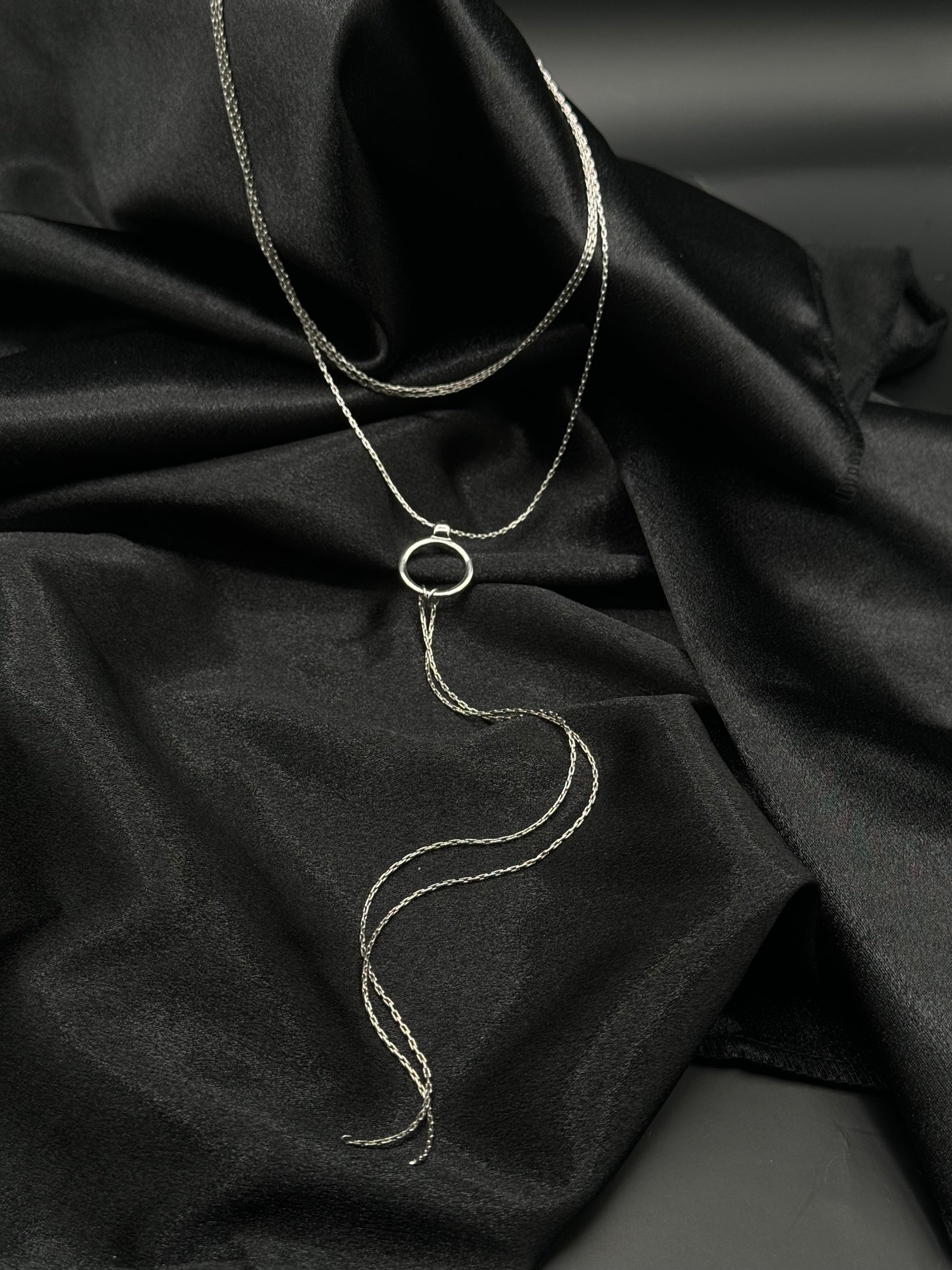 With a sleek double-layer design and a dramatic drop anchored by a circular pendant, Silver Eclipse captures the quiet spectacle of the moon crossing the sun. Its soft, serpentine chain glides along the skin while the lariat-style ring draws the eye downward in a line of luminous silver. It’s elegant, a little edgy, and perfect for the woman who turns heads without trying.