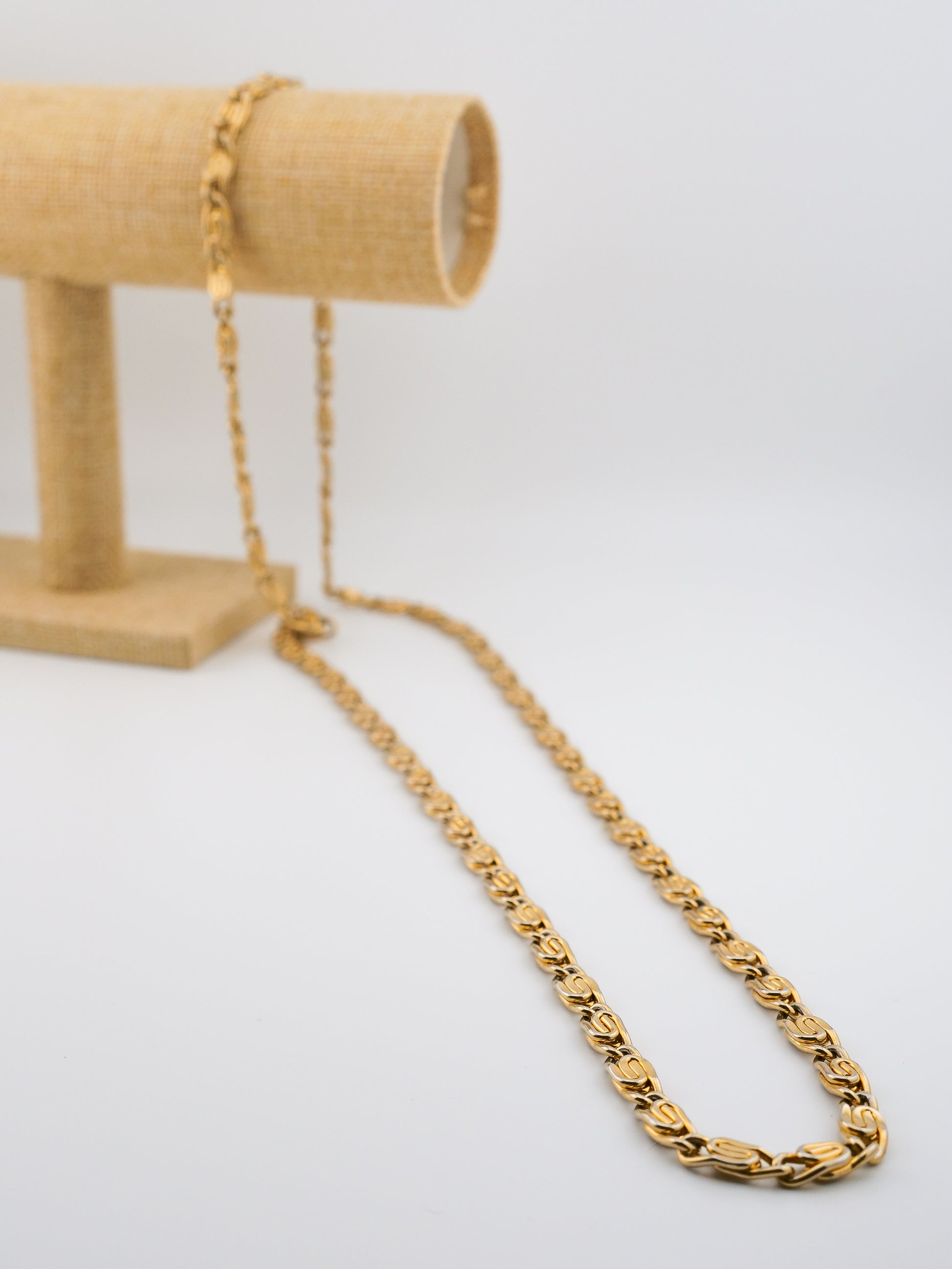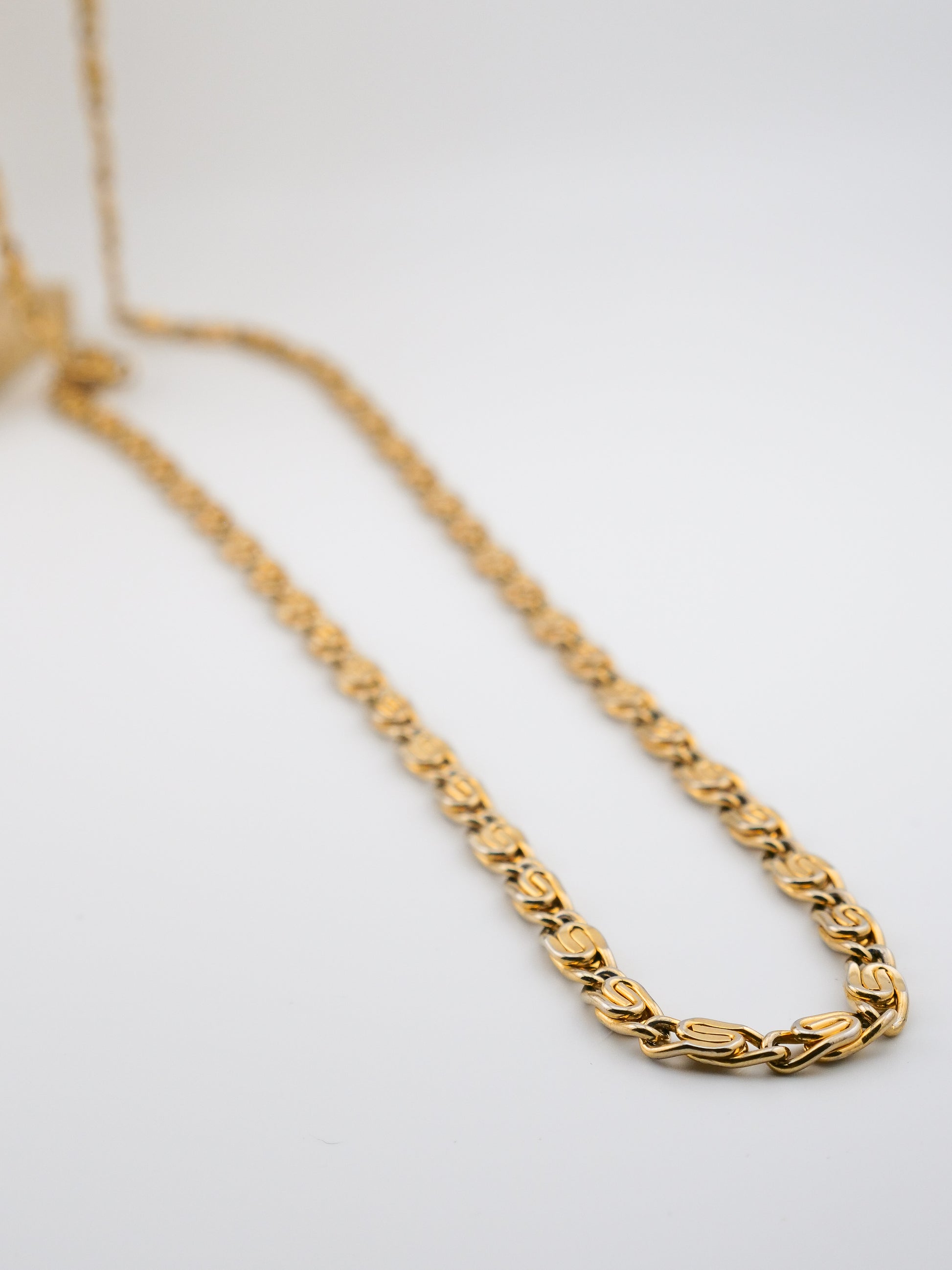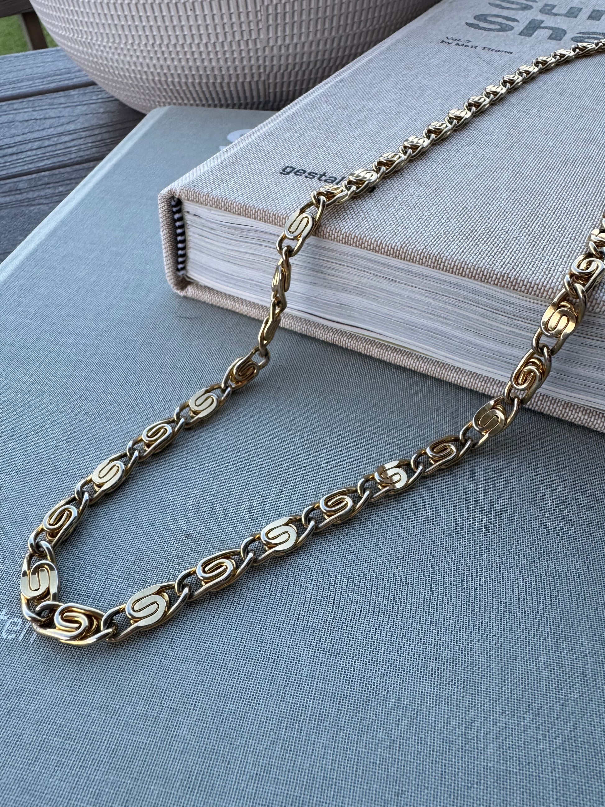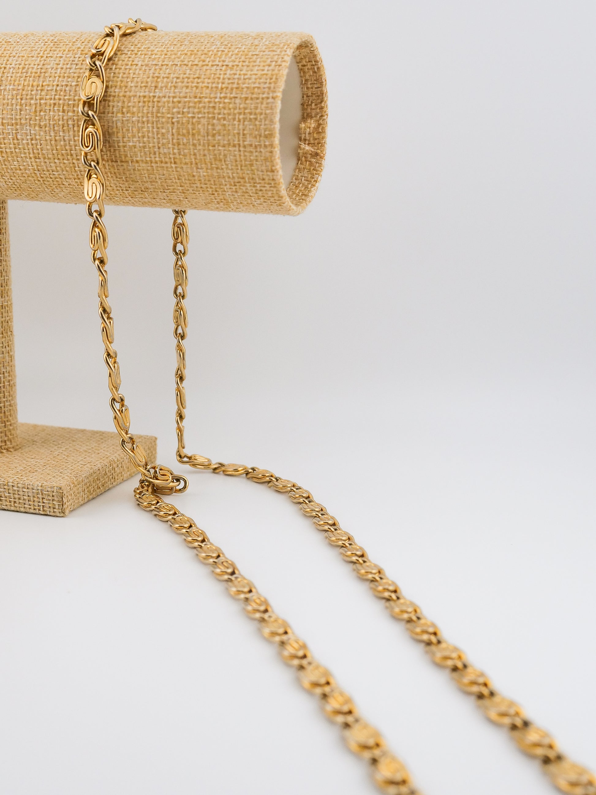 A striking vintage gold-tone chain with bold, geometric swirl links that catch the light with every movement. This piece has that unmistakable retro energy—strong, playful, and unapologetically stylish.