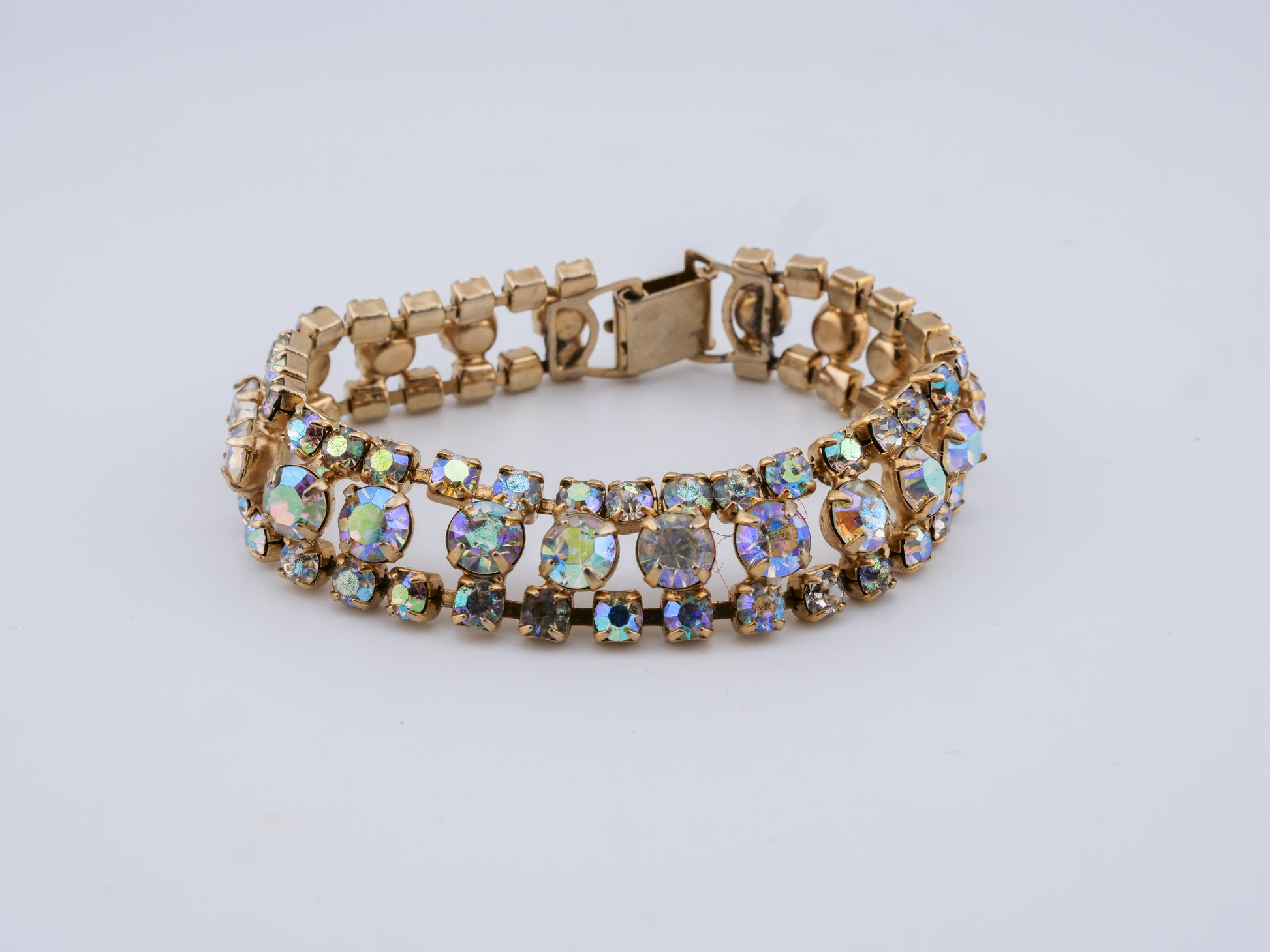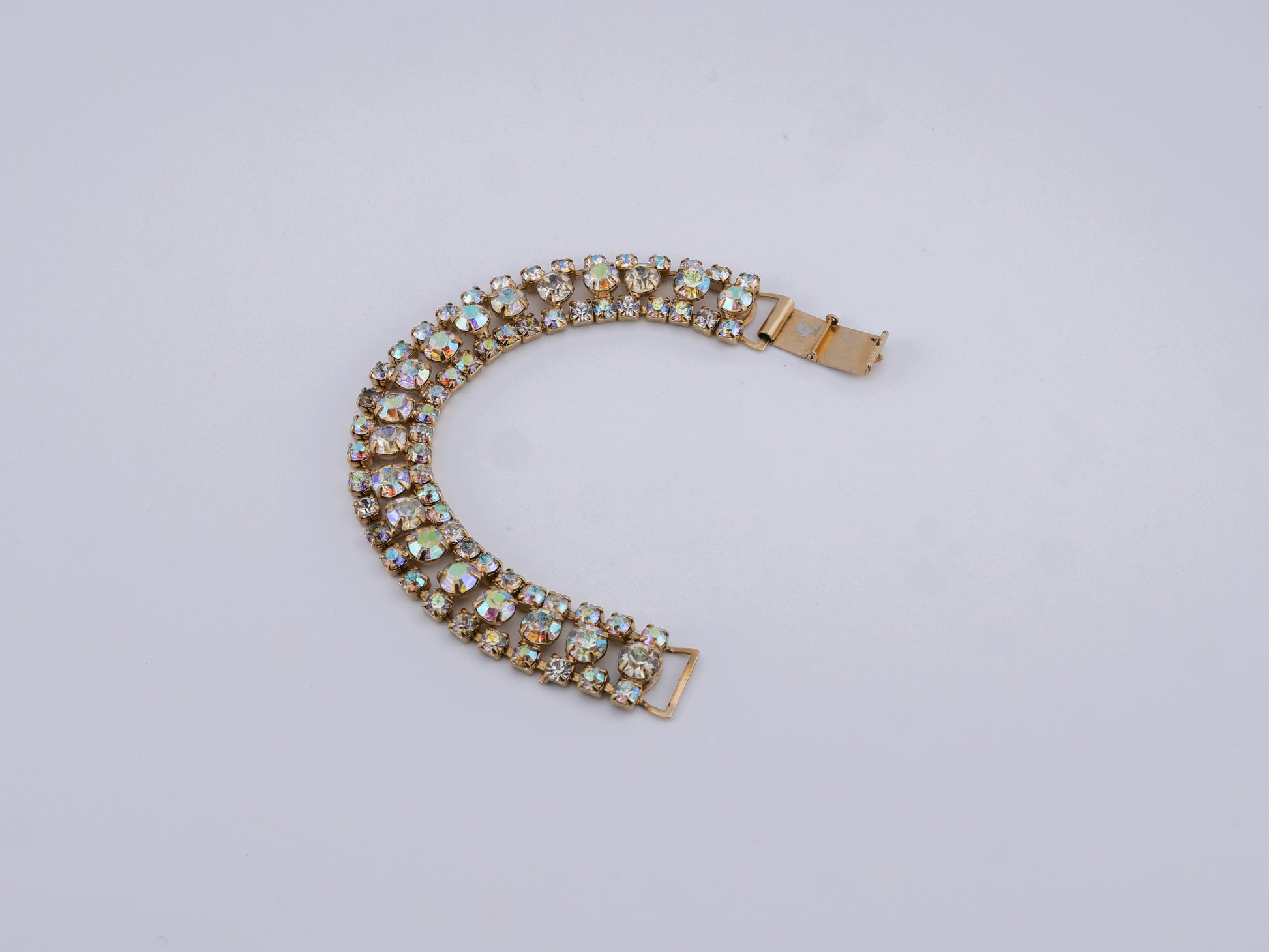 A rare Juliana (DeLizza & Elster) aurora borealis bracelet, flashing with rows of high-fire crystals that shift from ice-blue to rose-gold with every movement. The stones are prong-set in classic D&E construction, giving it that unmistakable mid-century glamour collectors love. Bold, sparkling, and elegant, it feels like wearing a strip of stardust across your wrist.