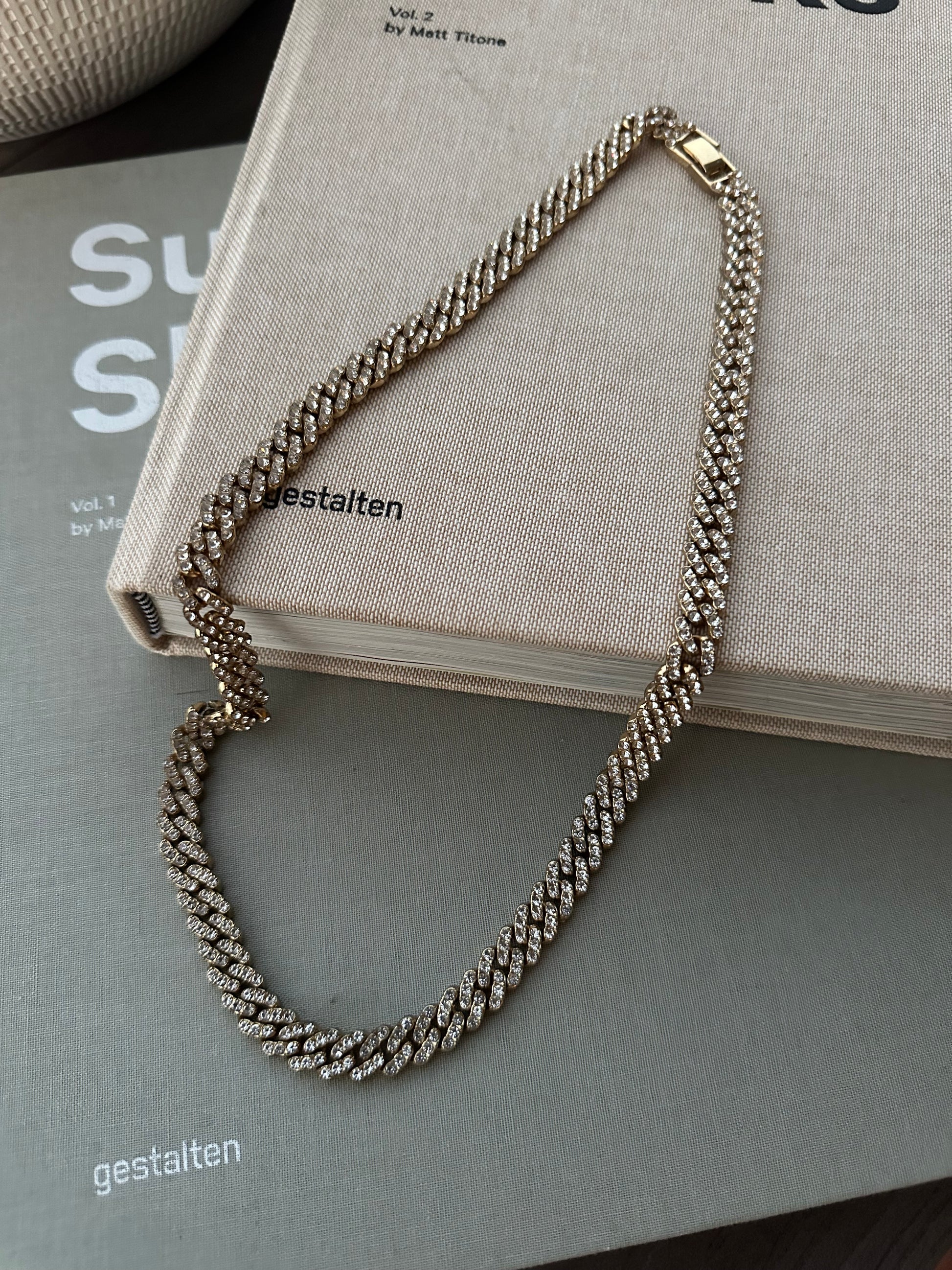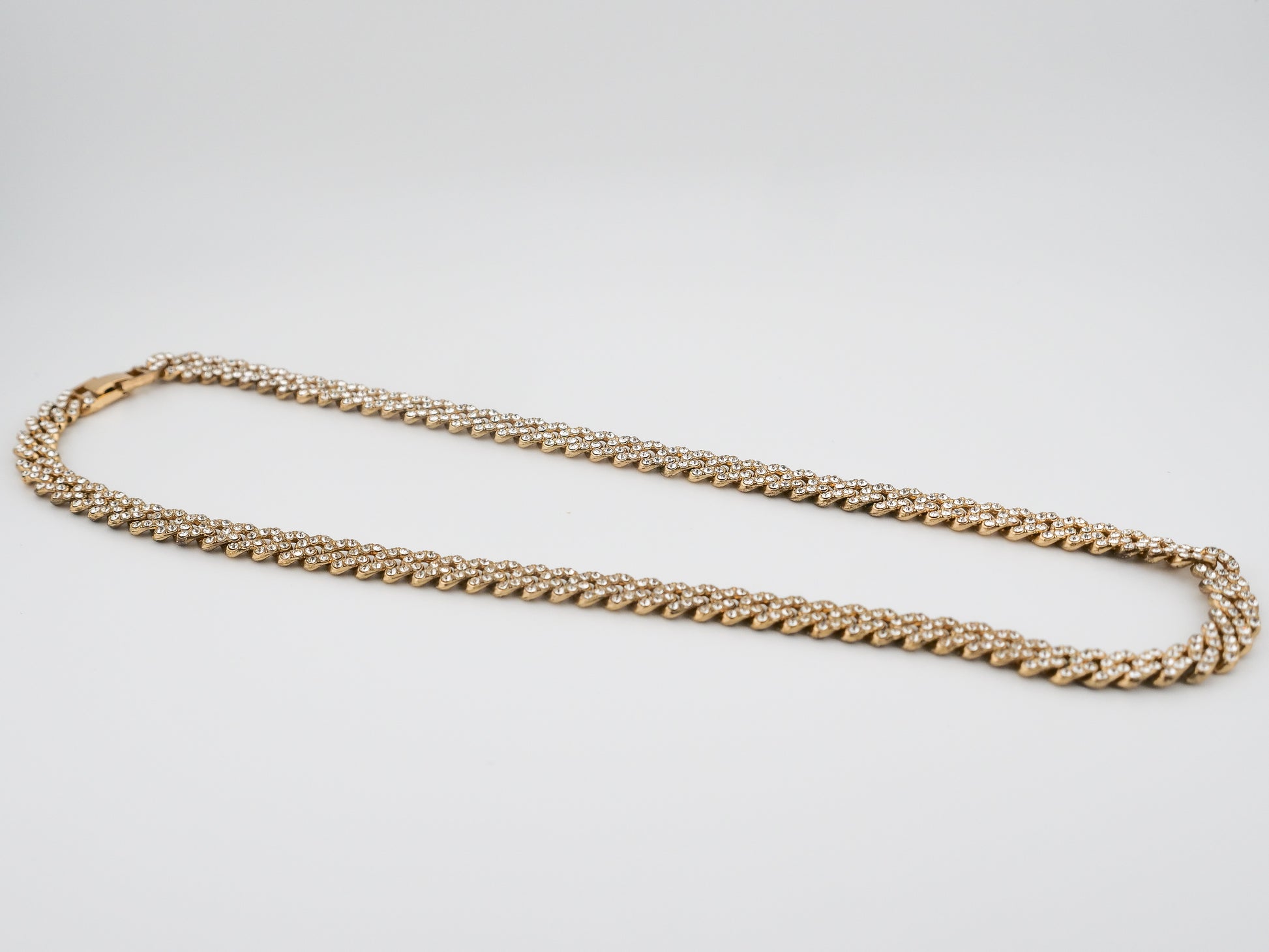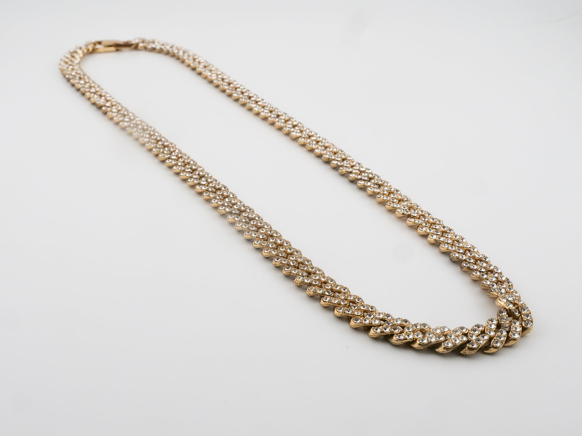 Make an entrance with this vintage gold-tone Cuban link chain, fully set with pavé crystals. Every link sparkles like starlight, giving you that high-shine, iced-out look without losing its vintage soul.
