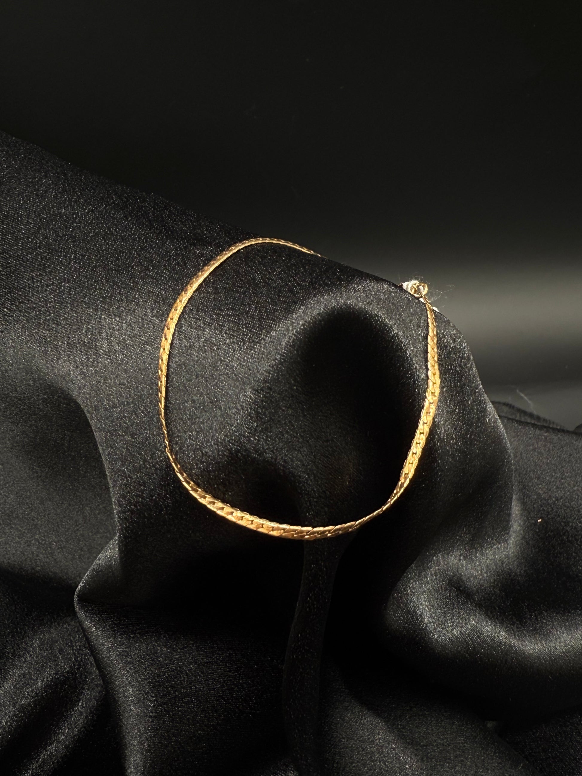 Sunkiss is a vintage herringbone bracelet in warm 12k gold fill—smooth, flat, and endlessly reflective. Whether worn alone or layered, it adds golden warmth to any look. Think poolside poetry, heirloom skin, and the soft glow of the golden hour.