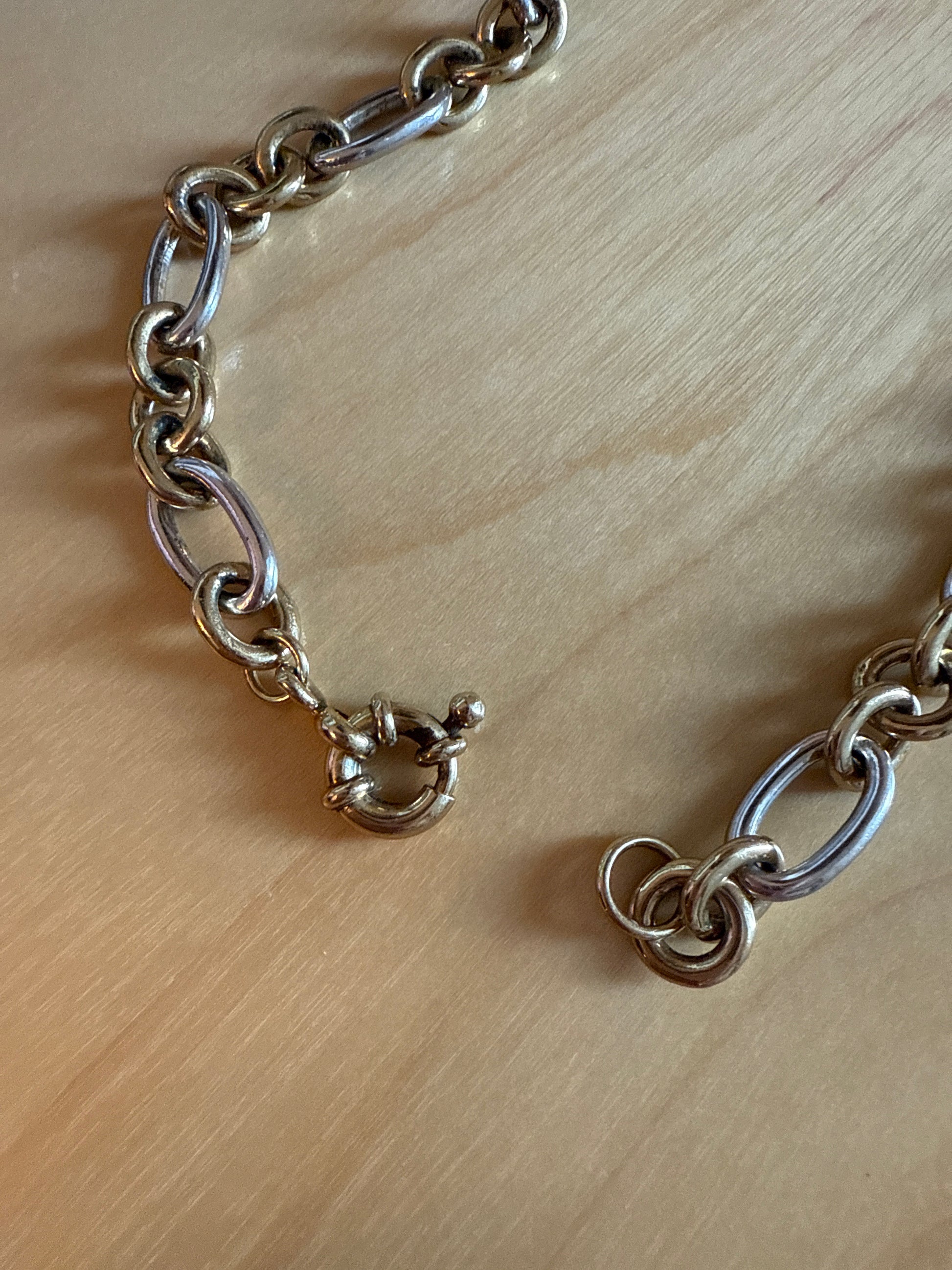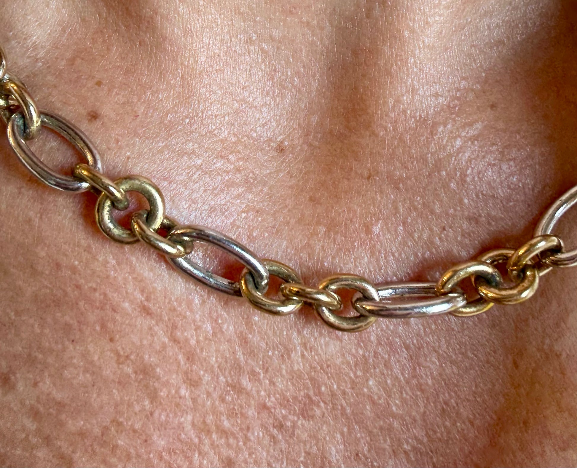 A timeless vintage set designed in luminous two-tone. The necklace features alternating yellow and white gold-tone oval links with a satisfying weight and smooth drape. The matching earrings tie the look together with sculptural knot loops - symbols of strength, connection, and balance. Both pieces are crafted in non-magnetic metal, suggesting higher-quality construction for lasting wear. Versatile and enduring, this set moves easily from tailored day looks to evening elegance.