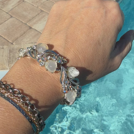 This signed rare vintage Lisner bracelet is a dreamy composition of milky moonstone-glass cabochons, sparkling aurora borealis rhinestones, and silver-tone leafwork that feels lifted straight from a twilight garden. The alternating stones and sculpted leaves create rhythm and movement along the wrist, catching the light with every gesture. Lisner was known for exceptional craftsmanship, and this piece shows it—substantial, fluid, and thoughtfully constructed with a secure fold-over clasp.