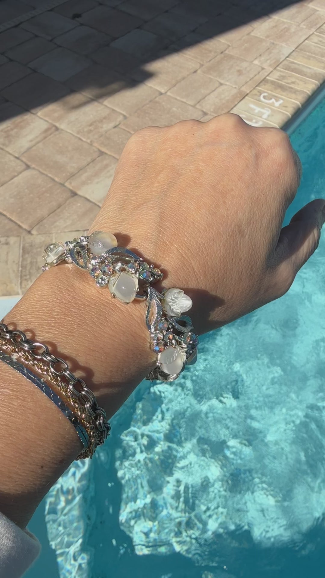 There’s something unmistakably feminine and otherworldly about this bracelet. The soft glow of the stones paired with the icy sparkle of the rhinestones gives it a quiet drama—elegant rather than flashy. It’s the kind of vintage piece that elevates everything from a simple sweater to an evening look, and it carries that mid-century sense of glamour that feels both nostalgic and timeless.