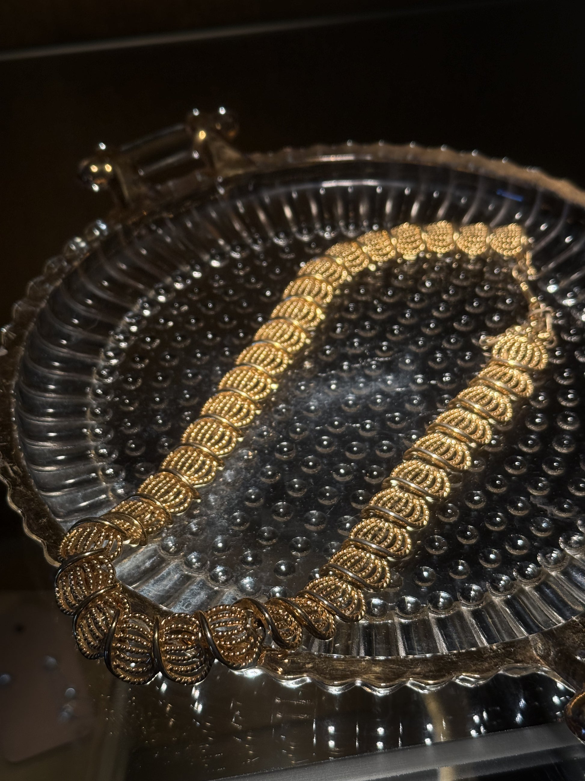The golden tone gleams with vintage warmth, while the layered design evokes a softness that knows its strength. Both pieces feels architectural, like they are meant to shield, shimmer, and be seen.