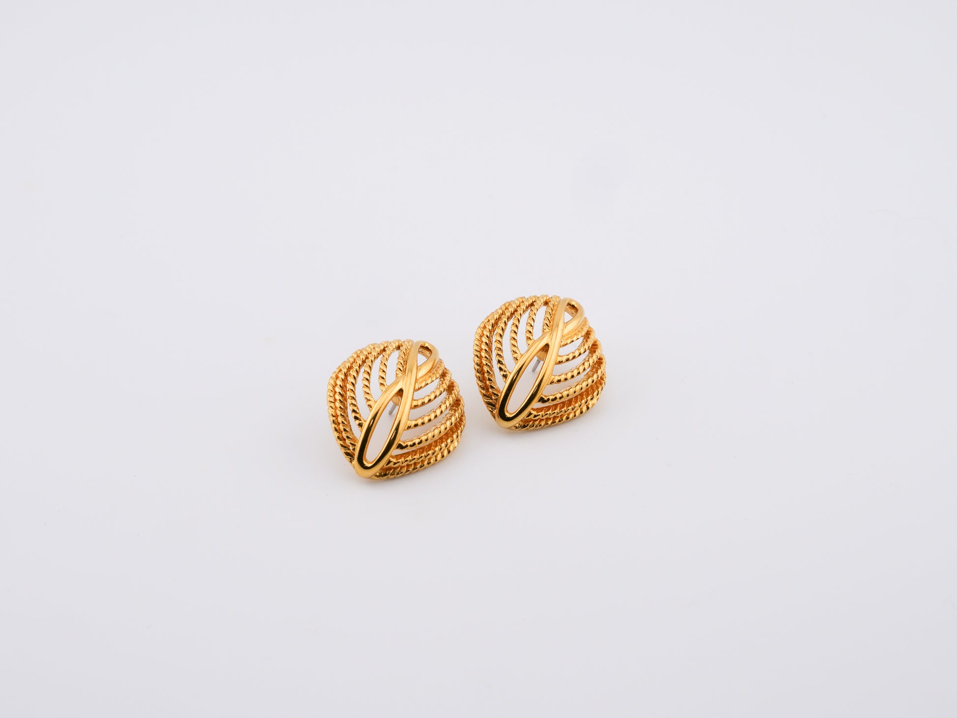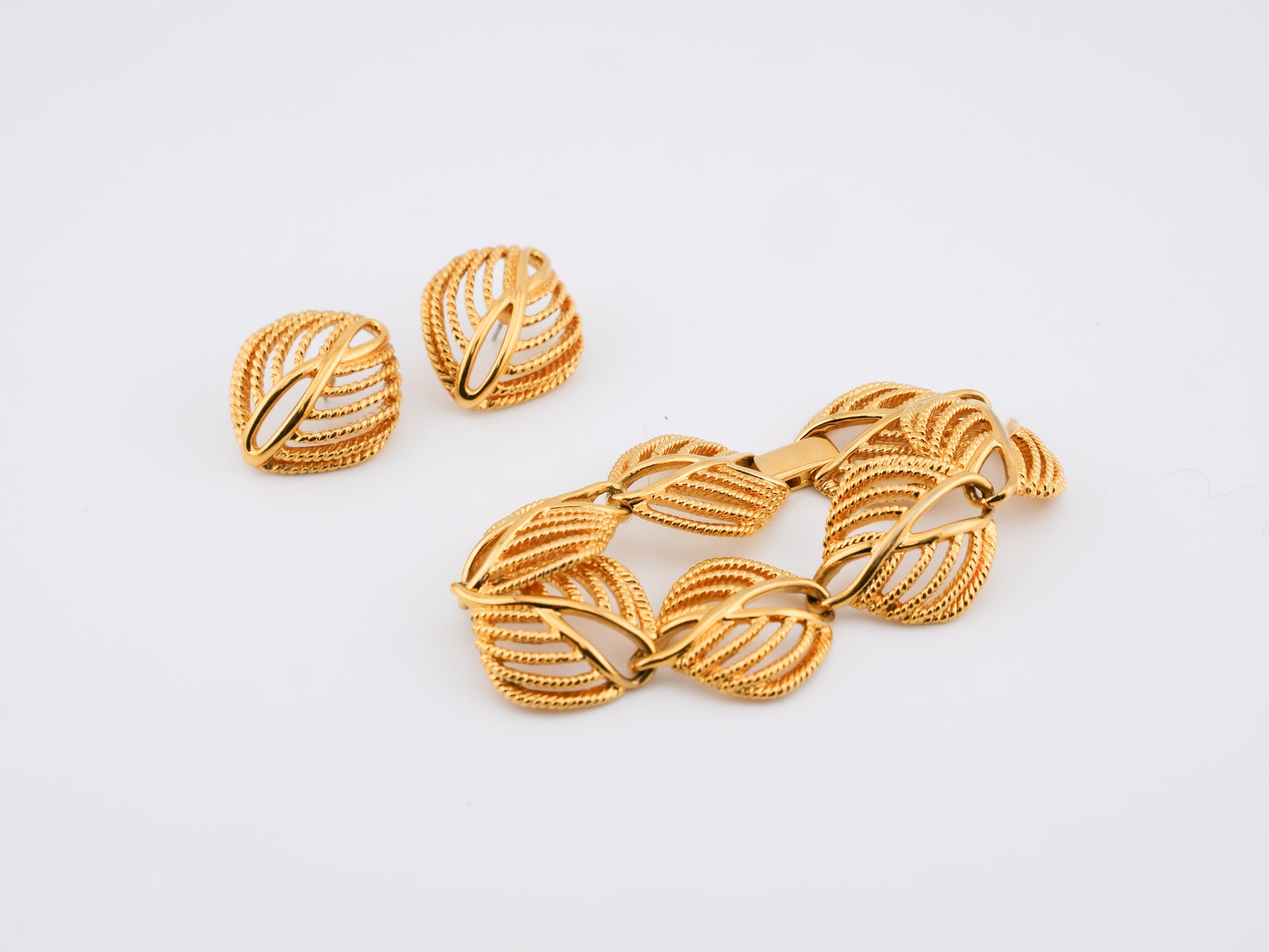 This vintage Napier bracelet and post earring set features a repeating leaf motif rendered in warm gold tone with fine linear texture and dimensional contouring. The bracelet has a strong, fluid presence on the wrist — substantial without being heavy — while the matching earrings echo the same sculptural leaf form for a pulled-together, intentional look. Napier was known for its impeccable metalwork, and this set is a perfect example: crisp construction, balanced proportions, and that unmistakable mid-century confidence.